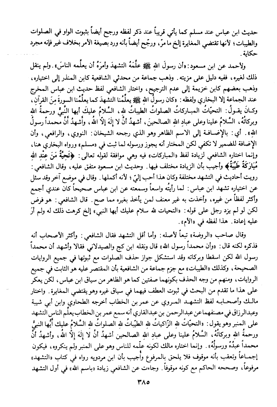 ولأحمد عن ابن مسعود: "أن رسولَ اللهِ -صلى الله عليه وسلم- علَّمَهُ التشهدَ وأمرَهُ أن يعلِّمه الناسَ". ولم ينقل ذلك لغيره، ففيه دليل على مزيته. وذهب جماعة من محدثي الشافعية كابن المنذر إلى اختياره، وذهب بعضهم كابن خزيمة إلى عدم الترجيح، واختار الشافعي لفظ حديث ابن عباس المخرج عند الجماعة إلا البخاري ولفظه: "كان رسولُ اللهِ -صلى الله عليه وسلم- يعلِّمُنا التشهدَ كما يعلِّمُنا السورةَ مِنَ القرآنِ، وكانَ يقولُ: التحيّاتُ المباركاتُ الصلواتُ الطيباتُ لله، السَّلامُ عليكَ أيها النَّبيُّ ورحمةُ اللهِ وبركاتُهُ، السَّلامُ علينا وعلى عبادِ اللهِ الصالحينَ، أشهدُ أنَّ لا إِلهَ إلاَّ الله، وأشهدُ أنَّ محمدًا رسولُ اللهِ". أي: بالإضافة إلى الاسم الظاهر وهو الذي رجحه الشيخان: النووي، والرافعي، وأن الإضافة للضمير لا تكفي لكن المختار أنه يجوز ورسوله لما ثبت في "مسلم" ورواه البخاري هنا، وإنما اختاره الشافعي لزيادة لفظ "المباركات" فيه وهي موافقة لقوله تعالى: {تَحِيَّةً مِنْ عِنْدِ اللَّهِ مُبَارَكَةً طَيِّبَةً} وأجيب بأن الزيادة مختلف فيها. وحديث ابن مسعود متفق عليه، وقال الشافعي: رويت أحاديث في التشهد مختلفة وكان هذا أحب إليّ؛ لأنه أكملها. وقال في موضع آخر وقد سئل عن اختياره تشهد ابن عباس: لما رأيتُه واسعًا وسمعته عن ابن عباس صحيحًا كان عندي أجمع وأكثر لفظًا من غيره، وأخذت به غير معنف لمن يأخذ بغيره مما صح. قال الشافعي: هو فرض لكن لو لم يزد رجل على قوله: "التحيات لله سلام عليك أيها النبي" إلخ كرهت ذلك له ولم أرَ عليه إعادة. هذا لفظه في "الأم".