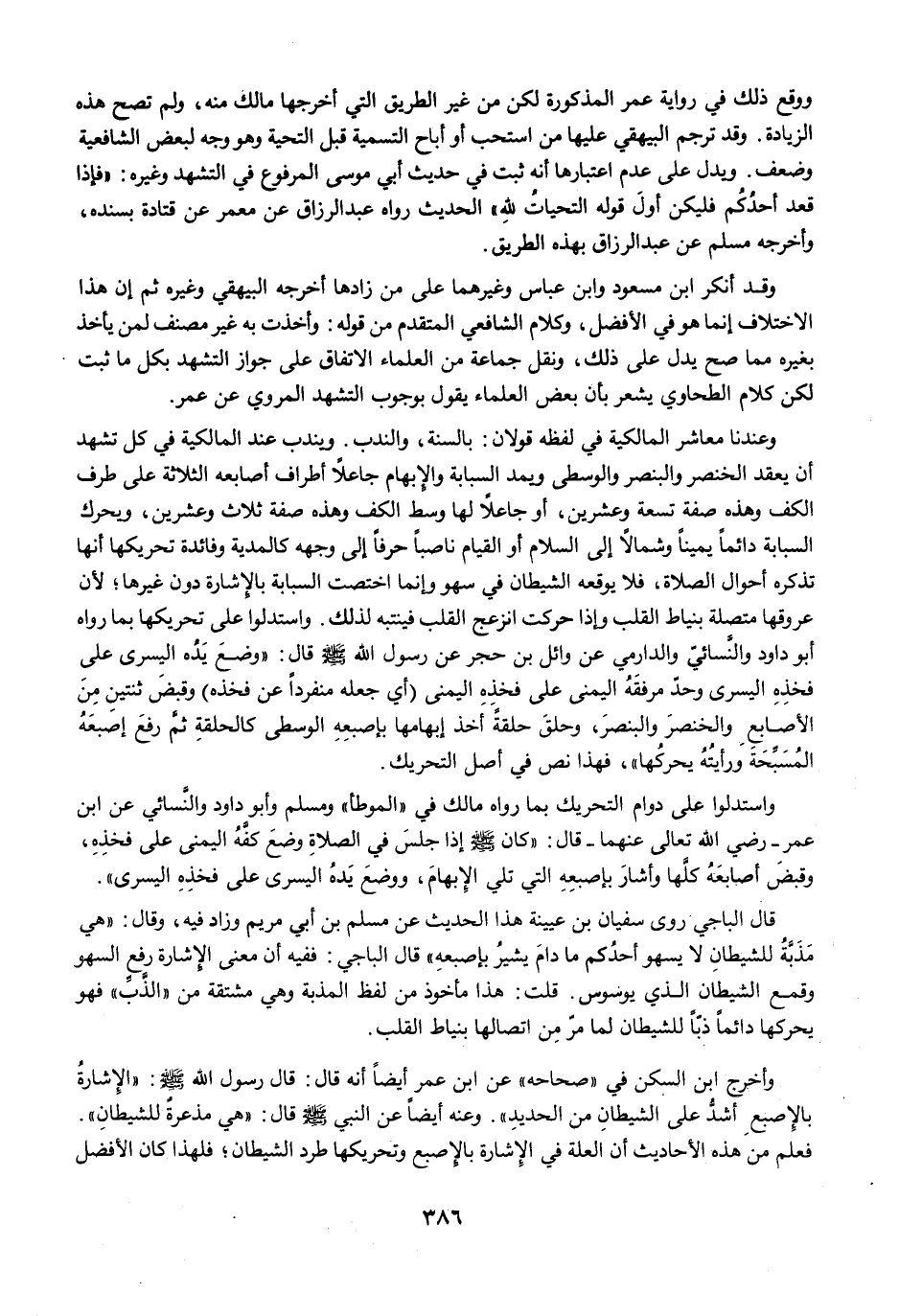 واستدلوا على دوام التحريك بما رواه مالك في "الموطأ" ومسلم وأبو داود والنَّسائي عن ابن عمر -رضي الله تعالى عنهما- قال: "كان -صلى الله عليه وسلم- إذا جلسَ في الصلاةِ وضعَ كفَّهُ اليمنى على فخذِهِ، وقبضَ أصابعَهُ كلَّها وأشارَ بإصبعِهِ التي تلي الإِبهامَ، ووضعَ يَدهُ اليسرى على فخذِهِ اليسرى".