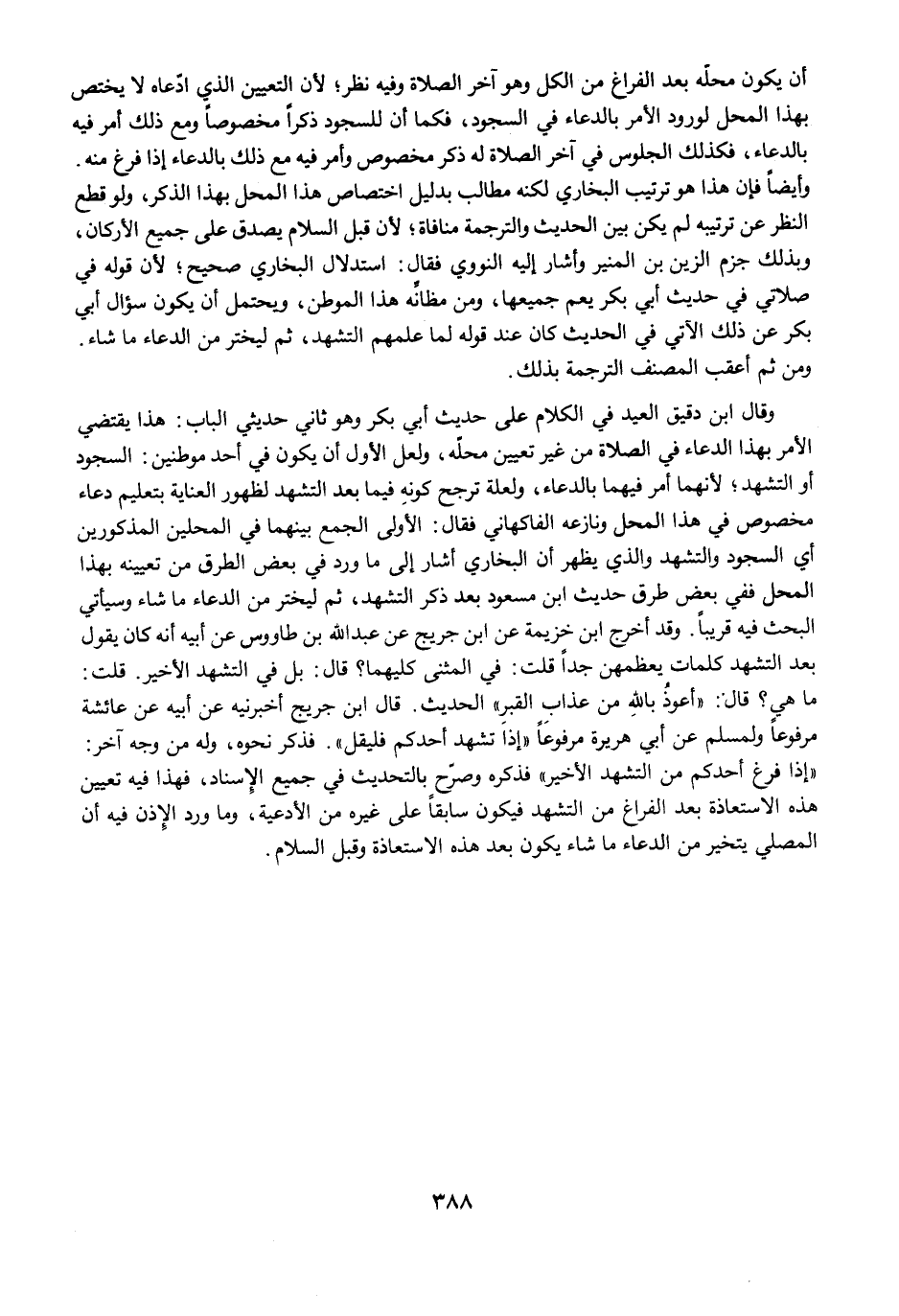 وقال ابن دقيق العيد في الكلام على حديث أبي بكر وهو ثاني حديثي الباب: هذا يقتضي الأمر بهذا الدعاء في الصلاة من غير تعيين محلّه، ولعل الأول أن يكون في أحد موطنين: السجود أو التشهد؛ لأنهما أمر فيهما بالدعاء، ولعلة ترجح كونهِ فيما بعد التشهد لظهور العناية بتعليم دعاء مخصوص في هذا المحل ونازعه الفاكهاني فقال: الأولى الجمع بينهما في المحلين المذكورين أي السجود والتشهد والذي يظهر أن البخاري أشار إلى ما ورد في بعض الطرق من تعيينه بهذا المحل ففي بعض طرق حديث ابن مسعود بعد ذكر التشهد، ثم ليختر من الدعاء ما شاء وسيأتي البحث فيه قريبًا. وقد أخرج ابن خزيمة عن ابن جريج عن عبد الله بن طاووس عن أبيه أنه كان يقول بعد التشهد كلمات يعظمهن جدًا قلت: في المثنى كليهما؟ قال: بل في التشهد الأخير. قلت: ما هي؟ قال: "أعوذُ باللهِ من عذابِ القبرِ" الحديث. قال ابن جريج أخبرنيه عن أبيه عن عائشة مرفوعًا ولمسلم عن أبي هريرة مرفوعًا "إذا تشهد أحدكم فليقل". فذكر نحوه، وله من وجه آخر: "إذا فرغ أحدكم من التشهد الأخير" فذكره وصرّح بالتحديث في جميع الإِسناد، فهذا فيه تعيين هذه الاستعاذة بعد الفراغ من التشهد فيكون سابقًا على غيره من الأدعية، وما ورد الإِذن فيه أن المصلي يتخير من الدعاء ما شاء يكون بعد هذه الاستعاذة وقبل السلام.