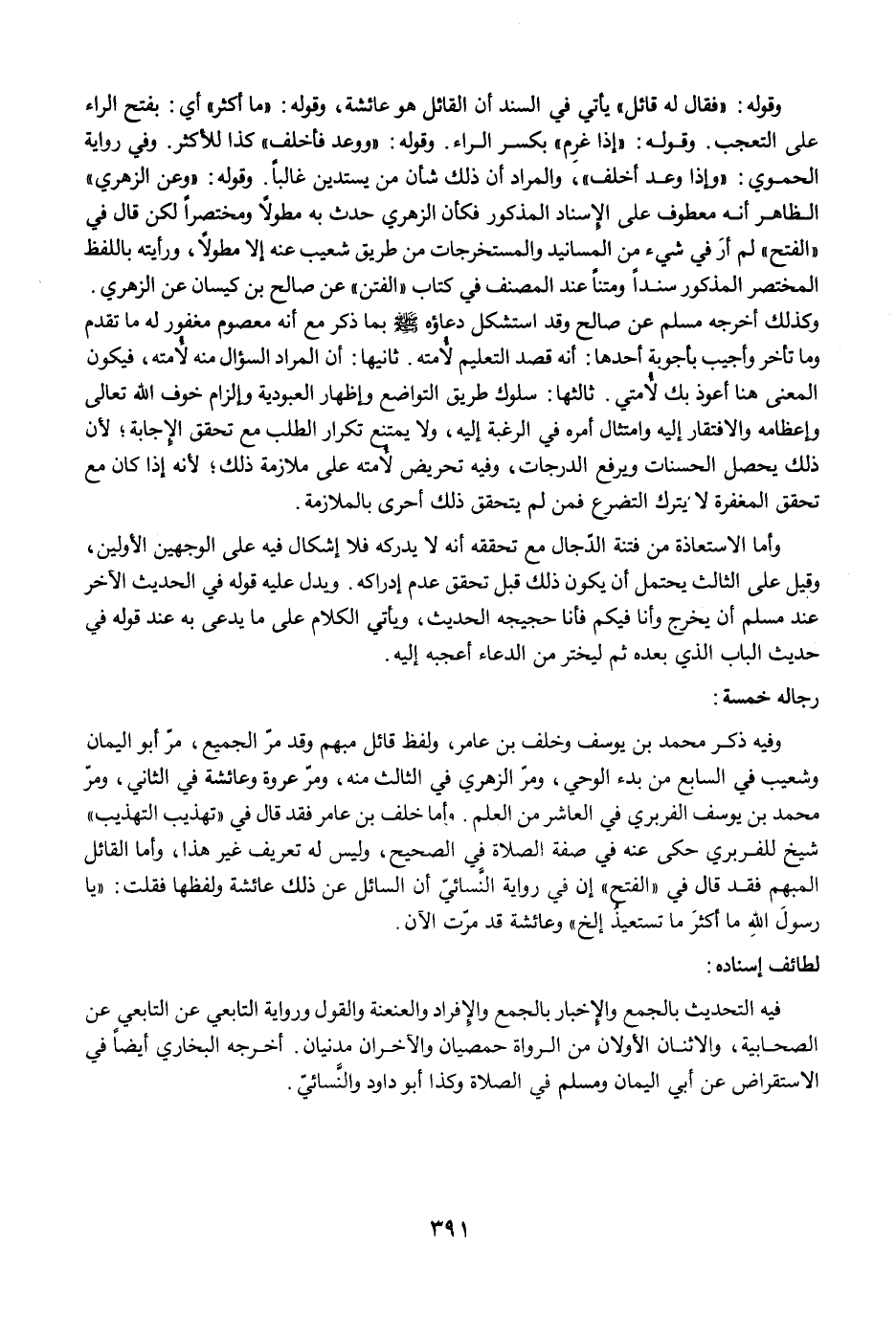 وفيه ذكر محمد بن يوسف وخلف بن عامر، ولفظ قائل مبهم وقد مرّ الجميع، مرّ أبو اليمان وشعيب في السابع من بدء الوحي، ومرّ الزهري في الثالث منه، ومرّ عروة وعائشة في الثاني، ومرّ محمد بن يوسف الفربري في العاشر من العلم. وأما خلف بن عامر فقد قال في "تهذيب التهذيب" شيخ للفربري حكى عنه في صفة الصلاة في الصحيح، وليس له تعريف غير هذا، وأما القائل المبهم فقد قال في "الفتح" إن في رواية النَّسائيّ أن السائل عن ذلك عائشة ولفظها فقلت: "يا رسولَ اللهِ ما أكثرَ ما تستعيذُ إلخ" وعائشة قد مرّت الآن.