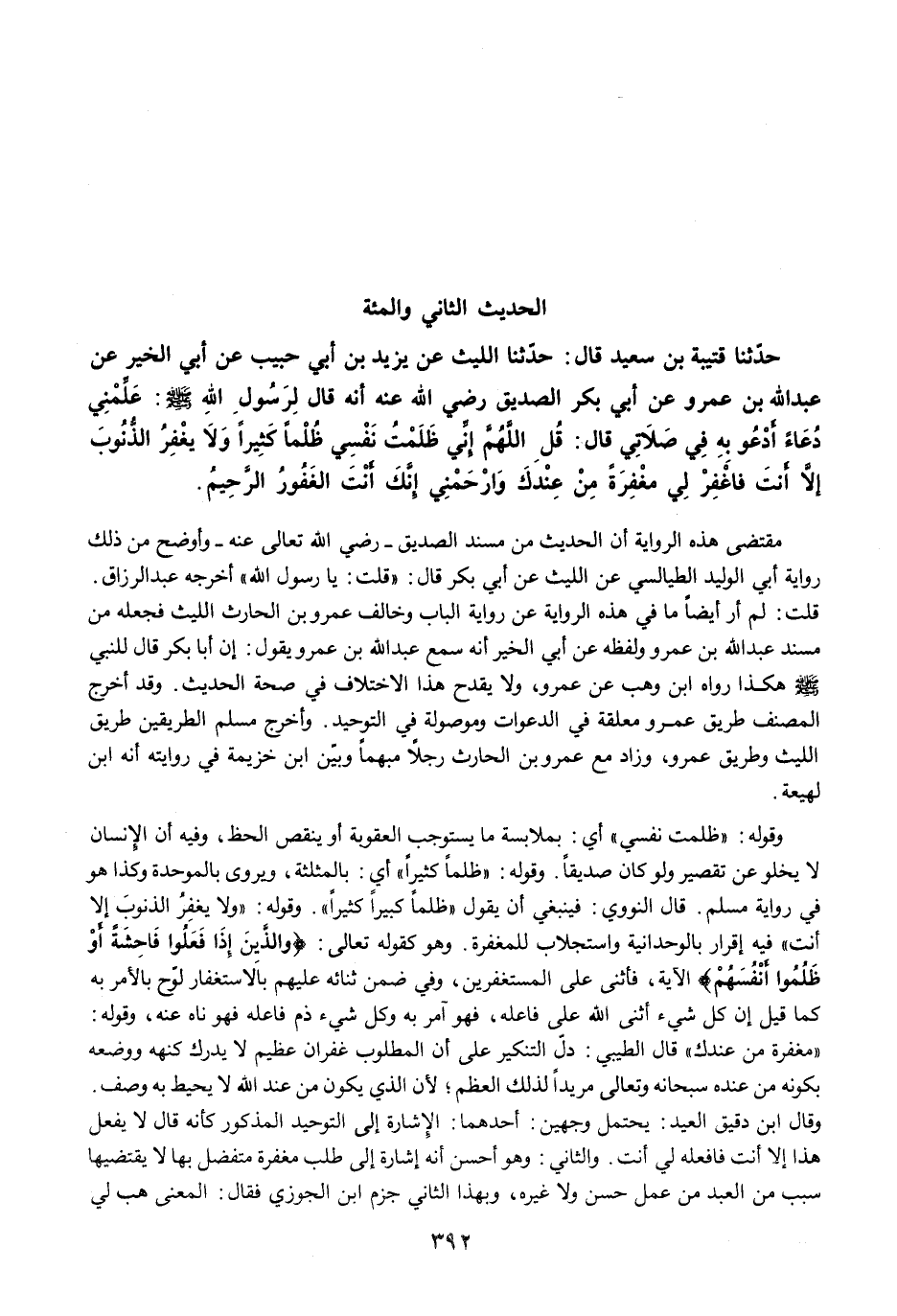 حَدَّثَنَا قُتَيْبَةُ بْنُ سَعِيدٍ قَالَ: حَدَّثَنَا اللَّيْثُ عَنْ يَزِيدَ بْنِ أَبِي حَبِيبٍ عَنْ أَبِي الْخَيْرِ عَنْ عَبْدِ اللَّهِ بْنِ عَمْرٍو عَنْ أَبِي بَكْرٍ الصِّدِّيقِ رضي الله عنه. أَنَّهُ قَالَ لِرَسُولِ اللَّهِ -صلى الله عليه وسلم-: عَلِّمْنِي دُعَاءً أَدْعُو بِهِ فِي صَلاَتِي. قَالَ: قُلِ اللَّهُمَّ إِنِّي ظَلَمْتُ نَفْسِي ظُلْمًا كَثِيرًا وَلاَ يَغْفِرُ الذُّنُوبَ إِلاَّ أَنْتَ، فَاغْفِرْ لِي مَغْفِرَةً مِنْ عِنْدِكَ، وَارْحَمْنِي إِنَّكَ أَنْتَ الْغَفُورُ الرَّحِيمُ.