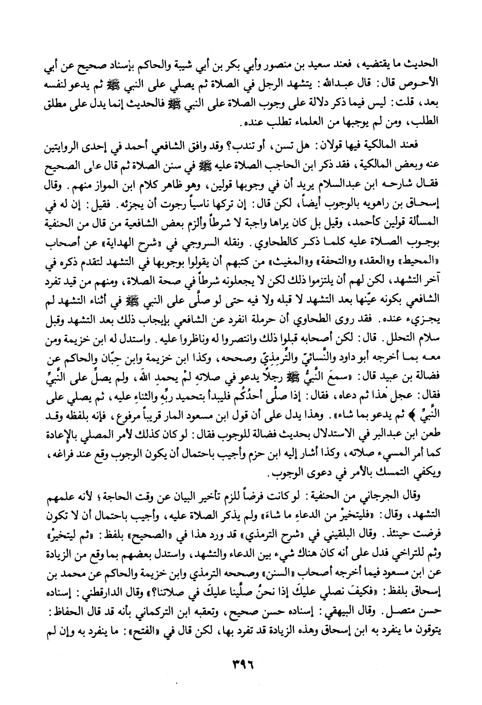 فعند المالكية فيها قولان: هل تسن، أو تندب؟ وقد وافق الشافعي أحمد في إحدى الروايتين عنه وبعض المالكية، فقد ذكر ابن الحاجب الصلاة عليه -صلى الله عليه وسلم- في سنن الصلاة ثم قال على الصحيح فقال شارحه ابن عبد السلام يريد أن في وجوبها قولين، وهو ظاهر كلام ابن المواز منهم. وقال إسحاق بن راهويه بالوجوب أيضًا، لكن قال: إن تركها ناسيًا رجوت أن يجزئه. فقيل: إن له في المسألة قولين كأحمد، وقيل بل كان يراها واجبة لا شرطًا وألزم بعض الشافعية من قال من الحنفية بوجوب الصلاة عليه كلما ذكر كالطحاوي. ونقله السروجي في "شرح الهداية" عن أصحاب "المحيط" و"العقد" و"التحفة" و"المغيث" من كتبهم أن يقولوا بوجوبها في التشهد لتقدم ذكره في آخر التشهد، لكن لهم أن يلتزموا ذلك لكن لا يجعلونه شرطًا في صحة الصلاة، ومنهم من قيد تفرد الشافعي بكونه عيّنها بعد التشهد لا قبله ولا فيه حتى لو صلَّى على النبي -صلى الله عليه وسلم- في أثناء التشهد لم يجزىء عنده. فقد روى الطحاوي أن حرملة انفرد عن الشافعي بإيجاب ذلك بعد التشهد وقبل سلام التحلل. قال: لكن أصحابه قبلوا ذلك وانتصروا له وناظروا عليه. واستدل له ابن خزيمة ومن معه بما أخرجه أبو داود والنَّسائيُّ والتِّرمِذِيّ وصححه، وكذا ابن خزيمة وابن حِبّان والحاكم عن فضالة بن عبيد قال: "سمعَ النَّبيُّ -صلى الله عليه وسلم- رجلًا يدعو في صلاتهِ لمْ يحمدِ اللهَ، ولم يصلِّ على النَّبيِّ فقال: عجل هذا ثم دعاه، فقال: إذا صلَّى أحدُكُم فليبدأ بتحميد ربِّهِ والثناءِ عليه، ثم يصلي على النَّبيِّ ثم يدعو بما شاء". وهذا يدل على أن قول ابن مسعود المار قريبًا مرفوع، فإنه بلفظه وقد طعن ابن عبد البر في الاستدلال بحديث فضالة للوجوب فقال: لو كان كذلك لأمر المصلي بالإعادة كما أمر المسيء صلاته، وكذا أشار إليه ابن حزم وأجيب باحتمال أن يكون الوجوب وقع عند فراغه، ويكفي التمسك بالأمر في دعوى الوجوب.