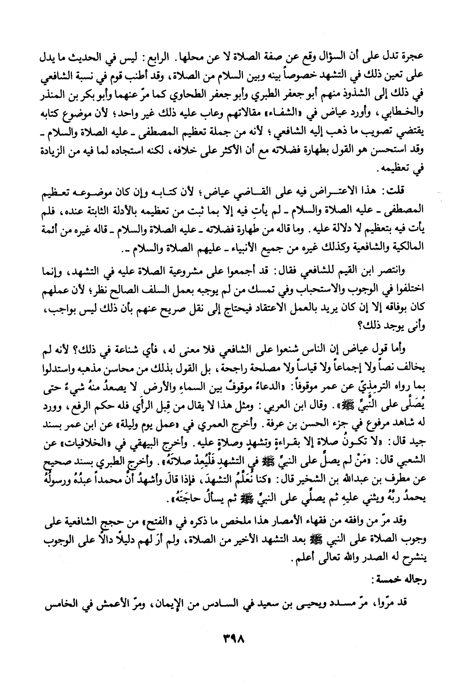 وأما قول عياض إن الناس شنعوا على الشافعي فلا معنى له، فأي شناعة في ذلك؟ لأنه لم يخالف نصًا ولا إجماعًا ولا قياسًا ولا مصلحة راجحة، بل القول بذلك من محاسن مذهبه واستدلوا بما رواه الترمِذِيّ عن عمر موقوفًا: "الدعاءُ موقوفٌ بين السماءِ والأرض لا يصعدُ منهُ شيءٌ حتى يُصَلَّى على النَّبيِّ -صلى الله عليه وسلم-". وقال ابن العربي: ومثل هذا لا يقال من قِبل الرأَي فله حكم الرفع، وورد له شاهد مرفوع في جزء الحسن بن عرفة. وأخرج العمري في "عمل يوم وليلة" عن ابن عمر بسند جيد قال: "لا تكونُ صلاة إلا بقراءةٍ وتشهدٍ وصلاةٍ عليه. وأخرج البيهقي في "الخلافيات" عن الشعبي قال: "مَنْ لم يصلِّ على النبيِّ -صلى الله عليه وسلم- في التشهدِ فَلْيُعِدْ صلاَتَهُ". وأخرج الطبري بسند صحيح عن مطرف بن عبد الله بن الشخير قال: "كنا نُعَلَّمُ التشهدَ، فإذا قالَ وأشهدُ أنَّ محمدًا عبدُهُ ورسولُهُ يحمدُ ربَّهُ ويثني عليهِ ثم يصلِّي على النبيِّ -صلى الله عليه وسلم- ثم يسألُ حاجَتَهُ".