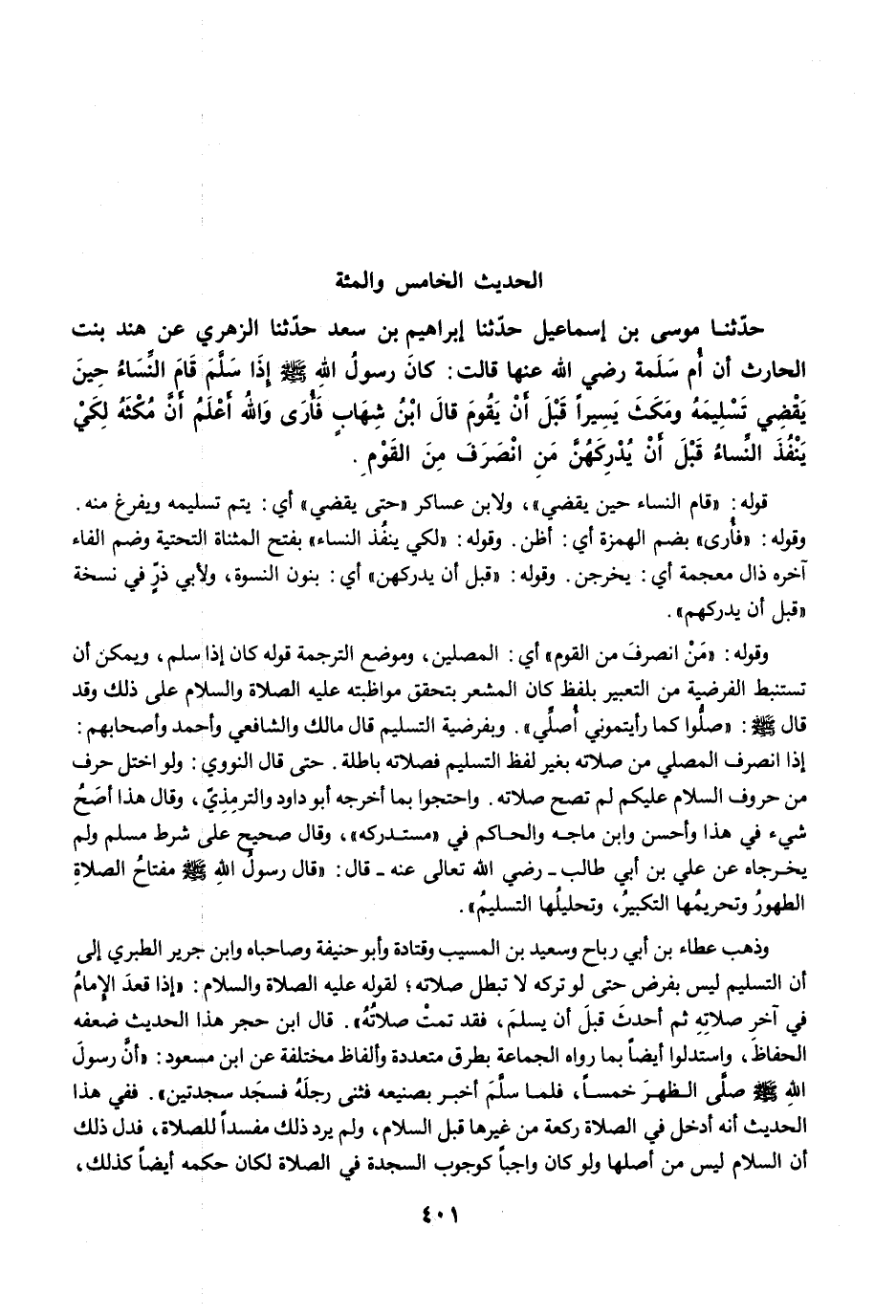 حَدَّثَنَا مُوسَى بْنُ إِسْمَاعِيلَ حَدَّثَنَا إِبْرَاهِيمُ بْنُ سَعْدٍ حَدَّثَنَا الزُّهْرِيُّ عَنْ هِنْدٍ بِنْتِ الْحَارِثِ أَنَّ أُمَّ سَلَمَةَ رضي الله عنها قَالَتْ: كَانَ رَسُولُ اللَّهِ -صلى الله عليه وسلم- إِذَا سَلَّمَ قَامَ النِّسَاءُ حِينَ يَقْضِى تَسْلِيمَهُ، وَمَكَثَ يَسِيرًا قَبْلَ أَنْ يَقُومَ. قَالَ ابْنُ شِهَابٍ فَأُرَى وَاللَّهُ أَعْلَمُ أَنَّ مُكْثَهُ لِكَيْ يَنْفُذَ النِّسَاءُ قَبْلَ أَنْ يُدْرِكَهُنَّ مَنِ انْصَرَفَ مِنَ الْقَوْمِ.