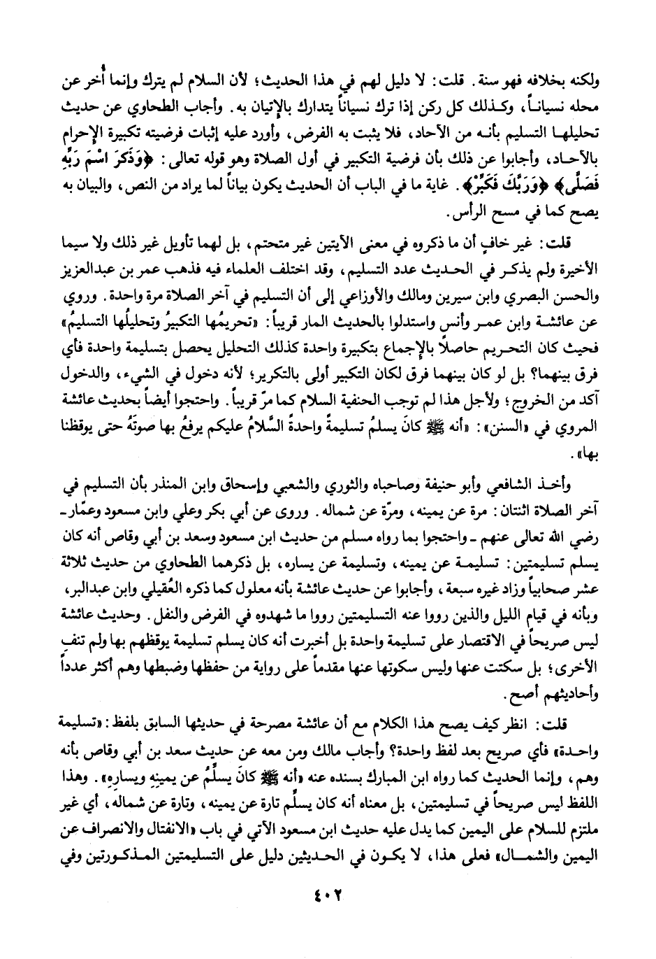 قلت: انظر كيف يصح هذا الكلام مع أن عائشة مصرحة في حديثها السابق بلفظ: "تسليمة واحدة" فأي صريح بعد لفظ واحدة؟ وأجاب مالك ومن معه عن حديث سعد بن أبي وقاص بأنه وهم، وإنما الحديث كما رواه ابن المبارك بسنده عنه "أنه -صلى الله عليه وسلم- كانَ يسلِّمُ عن يمينِهِ ويسارِهِ". وهذا اللفظ ليس صريحًا في تسليمتين، بل معناه أنه كان يسلِّم تارة عن يمينه، وتارة عن شماله، أي غير ملتزم للسلام على اليمين كما يدل عليه حديث ابن مسعود الآتي في باب "الانفتال والانصراف عن اليمين والشمال" فعلى هذا، لا يكون في الحديثين دليل على التسليمتين المذكورتين وفي