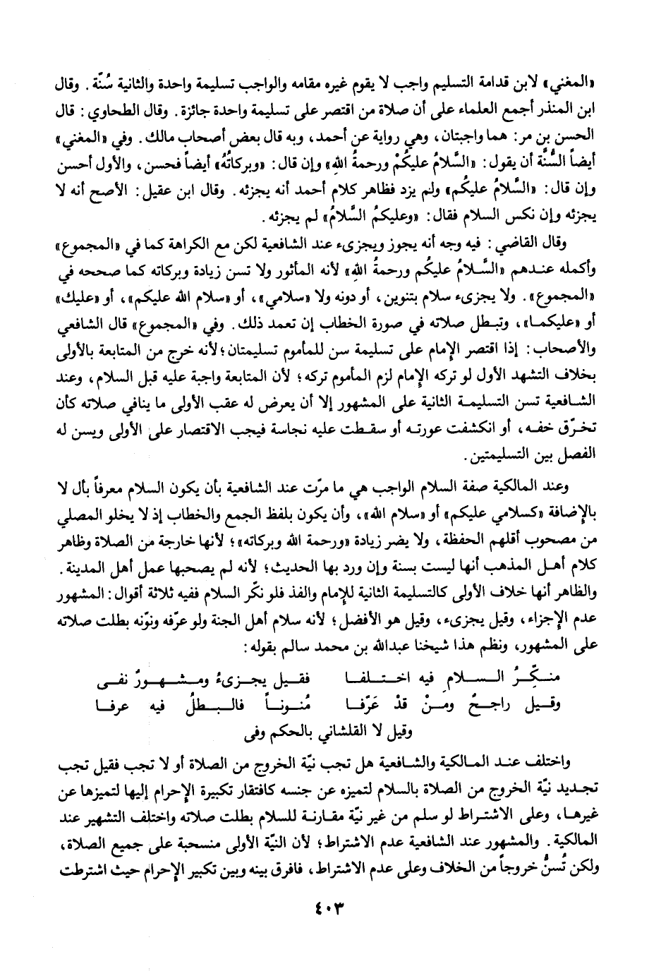 "المغني" لابن قدامة التسليم واجب لا يقوم غيره مقامه والواجب تسليمة واحدة والثانية سُنّة. وقال ابن المنذر أجمع العلماء على أن صلاة من اقتصر على تسليمة واحدة جائزة. وقال الطحاوي: قال الحسن بن مرَّ: هما واجبتان، وهي رواية عن أحمد، وبه قال بعض أصحاب مالك. وفي "المغني" أيضًا السُّنَّة أن يقول: "السَّلامُ عليكُمْ ورحمةُ اللهِ" وإن قال: "وبركاتُهُ" أيضًا فحسن، والأول أحسن وإن قال: "السَّلامُ عليكُم" ولم يزد فظاهر كلام أحمد أنه يجزئه. وقال ابن عقيل: الأصح أنه لا يجزئه وإن نكس السلام فقال: "وعليكمُ السَّلامُ" لم يجزئه.