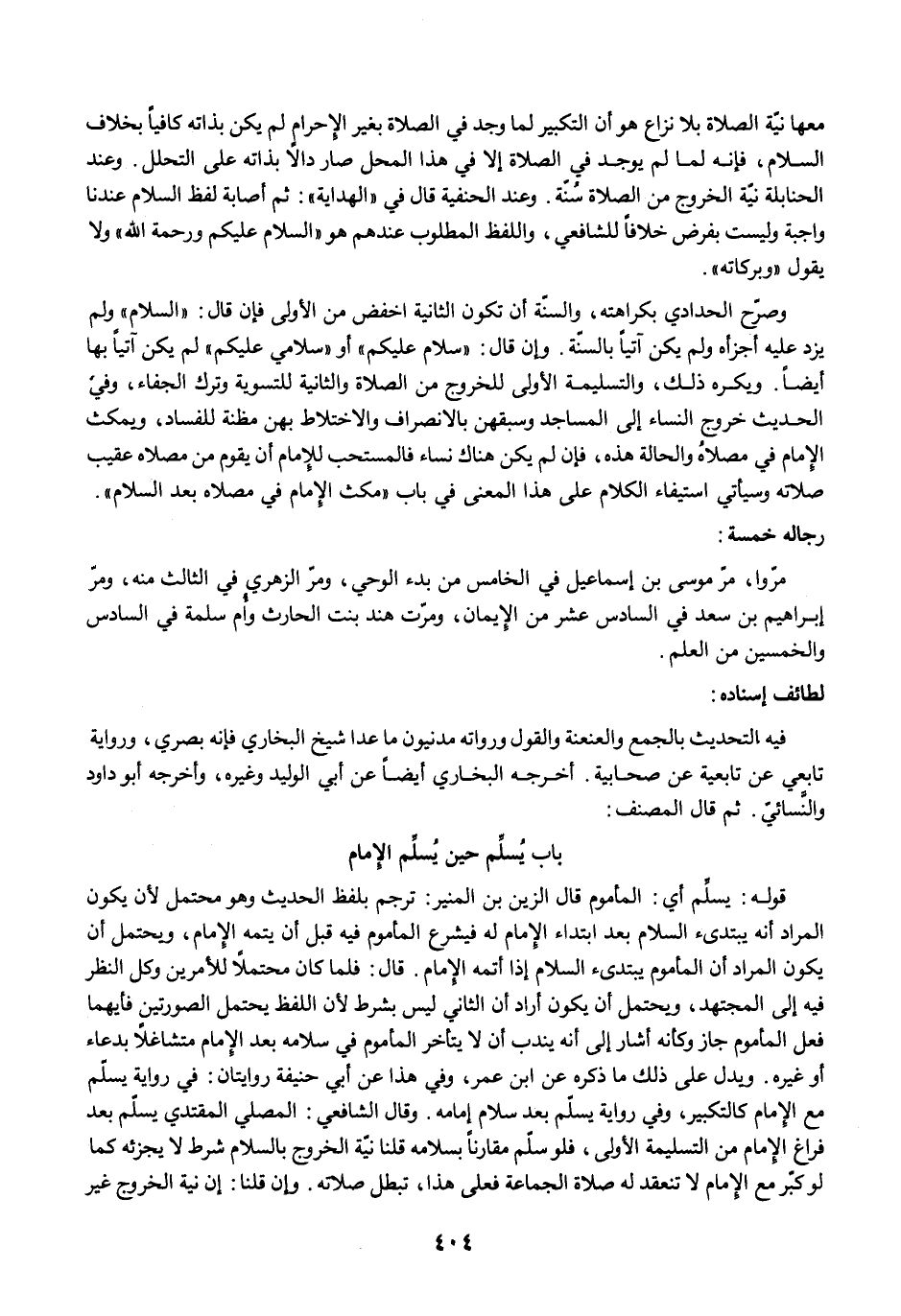 وصرّح الحدادي بكراهته، والسنّة أن تكون الثانية اخفض من الأولى فإن قال: "السلام" ولم يزد عليه أجزأه ولم يكن آتيًا بالسنّة. وإن قال: "سلام عليكم" أو "سلامي عليكم" لم يكن آتيًا بها أيضًا. ويكره ذلك، والتسليمة الأولى للخروج من الصلاة والثانية للتسوية وترك الجفاء، وفي الحديث خروج النساء إلى المساجد وسبقهن بالانصراف والاختلاط بهن مظنة للفساد، ويمكث الإِمام في مصلاهُ والحالة هذه، فإن لم يكن هناك نساء فالمستحب للإمام أن يقوم من مصلاه عقيب صلاته وسيأتي استيفاء الكلام على هذا المعنى في باب "مكث الإِمام في مصلاه بعد السلام ".