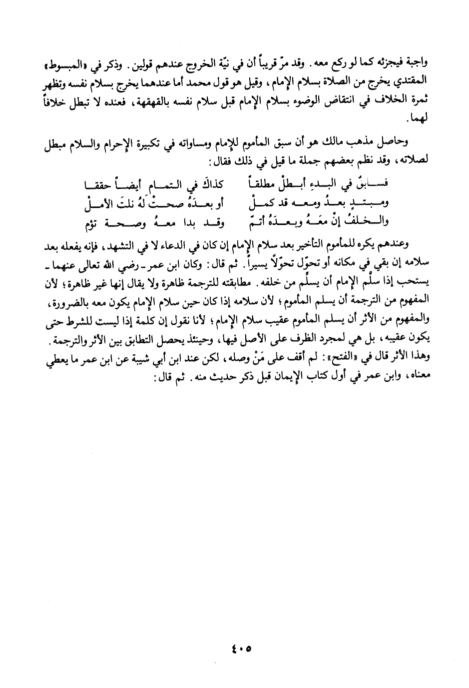 وعندهم يكره للمأموم التأخير بعد سلام الإِمام إن كان في الدعاء لا في التشهد، فإنه يفعله بعد سلامه إن بقي في مكانه أو تحوّل تحوّلًا يسيرًا. ثم قال: وكان ابن عمر -رضي الله تعالى عنهما- يستحب إذا سلَّم الإِمام أن يسلِّم من خلفه. مطابقته للترجمة ظاهرة ولا يقال إنها غير ظاهرة؛ لأن المفهوم من الترجمة أن يسلم المأموم؛ لأن سلامه إذا كان حين سلام الإِمام يكون معه بالضرورة، والمفهوم من الأثر أن يسلم المأموم عقيب سلام الإِمام؛ لأنا نقول إن كلمة إذا ليست للشرط حتى يكون عقيبه، بل هي لمجرد الظرف على الأصل فيها، وحينئذ يحصل التطابق بين الأثر والترجمة. وهذا الأثر قال في "الفتح": لم أقف على مَنْ وصله، لكن عند ابن أبي شيبة عن ابن عمر ما يعطي معناه، وابن عمر في أول كتاب الإيمان قبل ذكر حديث منه. ثم قال: