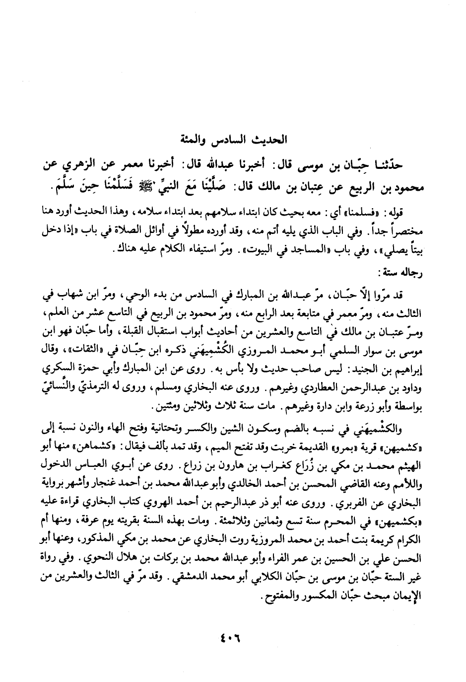 والكشْميهَني في نسبه بالضم وسكون الشين والكسر وتحتانية وفتح الهاء والنون نسبة إلى "كشميهن" قرية "بمرو" القديمة خربت وقد تفتح الميم، وقد تمد بألف فيقال: "كشماهن" منها أبو الهيثم محمد بن مكي بن زُرَاع كغراب بن هارون بن زراع. روى عن أبوي العباس الدخول واللأمم وعنه القاضي المحسن بن أحمد الخالدي وأبو عبد الله محمد بن أحمد غنجار وأشهر برواية البخاري عن الفربري. وروى عنه أبو ذر عبد الرحيم بن أحمد الهروي كتاب البخاري قراءة عليه "بكشميهن" في المحرم سنة تسع وثمانين وثلاثمئة. ومات بهذه السنة بقريته يوم عرفة، ومنها أم الكرام كريمة بنت أحمد بن محمد المروزية روت البخاري عن محمد بن مكي المذكور، وعنها أبو الحسن علي بن الحسين بن عمر الفراء وأبو عبد الله محمد بن بركات بن هلال النحوي. وفي رواة غير الستة حبّان بن موسى بن حبّان الكلابي أبو محمد الدمشقي. وقد مرّ في الثالث والعشرين من الإِيمان مبحث حبّان المكسور والمفتوح.