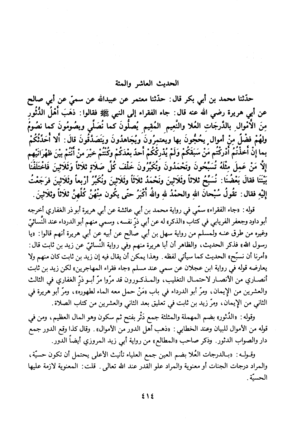 حَدَّثَنَا مُحَمَّدُ بْنُ أَبِي بَكْرٍ قَالَ: حَدَّثَنَا مُعْتَمِرٌ عَنْ عُبَيْدِ اللَّهِ عَنْ سُمَيٍّ عَنْ أَبِي صَالِحٍ عَنْ أَبِي هُرَيْرَةَ رضي الله عنه قَالَ" جَاءَ الْفُقَرَاءُ إِلَى النَّبِيِّ -صلى الله عليه وسلم- فَقَالُوا" ذَهَبَ أَهْلُ الدُّثُورِ مِنَ الأَمْوَالِ بِالدَّرَجَاتِ الْعُلاَ وَالنَّعِيمِ الْمُقِيمِ، يُصَلُّونَ كَمَا نُصَلِّي، وَيَصُومُونَ كَمَا نَصُومُ، وَلَهُمْ فَضْلٌ مِنْ أَمْوَالٍ يَحُجُّونَ بِهَا، وَيَعْتَمِرُونَ، وَيُجَاهِدُونَ، وَيَتَصَدَّقُونَ قَالَ: أَلاَ أُحَدِّثُكُمْ بِأَمْرٍ إِنْ أَخَذْتُمْ بِهِ أَدْرَكْتُمْ مَنْ سَبَقَكُمْ وَلَمْ يُدْرِكْكُمْ أَحَدٌ بَعْدَكُمْ، وَكُنْتُمْ خَيْرَ مَنْ أَنْتُمْ بَيْنَ ظَهْرَانَيْهِ، إِلاَّ مَنْ عَمِلَ مِثْلَهُ تُسَبِّحُونَ وَتَحْمَدُونَ، وَتُكَبِّرُونَ خَلْفَ كُلِّ صَلاَةٍ ثَلاَثًا وَثَلاَثِينَ. فَاخْتَلَفْنَا بَيْنَنَا فَقَالَ بَعْضُنَا: نُسَبِّحُ ثَلاَثًا وَثَلاَثِينَ، وَنَحْمَدُ ثَلاَثًا وَثَلاَثِينَ، وَنُكَبِّرُ أَرْبَعًا وَثَلاَثِينَ. فَرَجَعْتُ إِلَيْهِ فَقَالَ: تَقُولُ سُبْحَانَ اللَّهِ، وَالْحَمْدُ لِلَّهِ، وَاللَّهُ أَكْبَرُ، حَتَّى يَكُونَ مِنْهُنَّ كُلِّهِنَّ ثَلاَثًا وَثَلاَثِينَ.