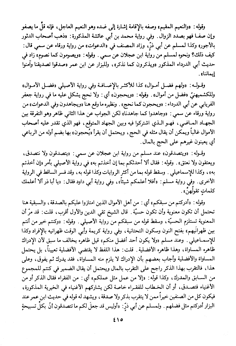 وقوله: "ولهم فضل أموال" كذا للأكثر بالإضافة وفي رواية الأصيلي "فضل الأموال" وللكشميهنيّ "فضل من أموال". وقوله: "ويحجون" أي: ولا نحج يشكل عليه ما في رواية جعفر الفريابي عن أبي الدرداء: "ويحجون كما نحج". ونظيره ما وقع هنا "ويجاهدون وفي الدعوات" من رواية ورقاء عن سمي: "وجاهدوا كما جاهدنا" لكن الجواب عن هذا الثاني ظاهر وهو التفرقة بين الجهاد الماضي، فهو الذي اشتركوا فيه وبين الجهاد المتوقع، فهو الذي تقدر عليه أصحاب الأموال غالبًا ويمكن أن يقال مثله في الحج، ويحتمل أن يقرأ "يُحجون" بها بضم أوله من الرباعي أي يعينون غيرهم على الحج بالمال.