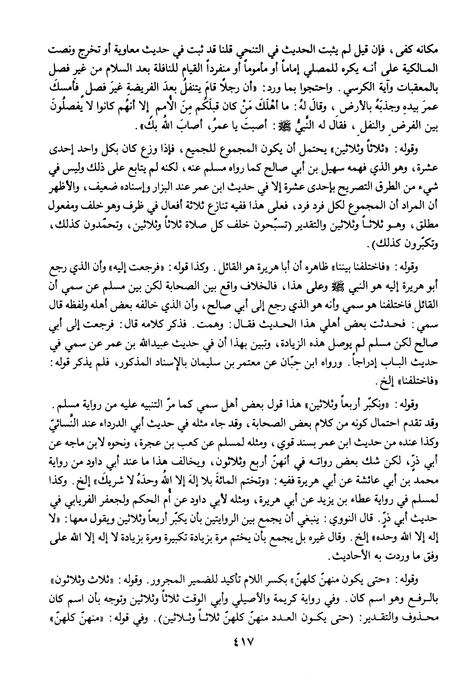 وقوله: "ثلاثًا وثلاثين" يحتمل أن يكون المجموع للجميع، فإذا وزع كان بكل واحد إحدى عشرة، وهو الذي فهمه سهيل بن أبي صالح كما رواه مسلم عنه، لكنه لم يتابع على ذلك وليس في شيء من الطرق التصريح بإحدى عشرة إلا في حديث ابن عمر عند البزار وإسناده ضعيف، والأظهر أن المراد أن المجموع لكل فرد فرد، فعلى هذا ففيه تنازع ثلاثة أفعال في ظرف وهو خلف ومفعول مطلق، وهو ثلاثًا وثلاثين والتقدير (تسبّحون خلف كل صلاة ثلاثًا وثلاثين، وتحمّدون كذلك، وتكبّرون كذلك).