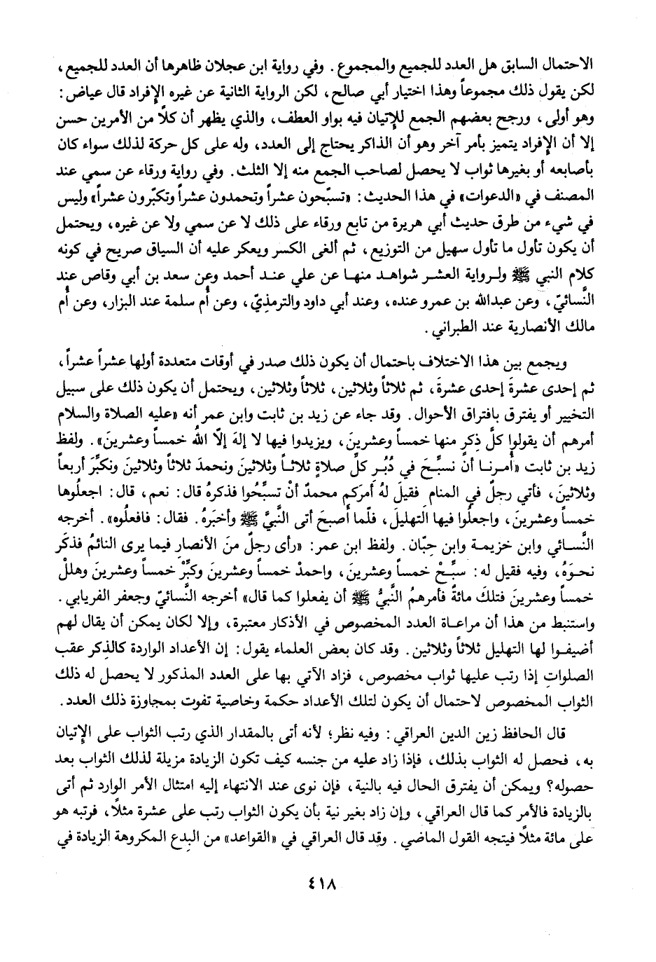 قال الحافظ زين الدين العراقي: وفيه نظر؛ لأنه أتى بالمقدار الذي رتب الثواب على الإتيان به، فحصل له الثواب بذلك، فإذا زاد عليه من جنسه كيف تكون الزيادة مزيلة لذلك الثواب بعد حصوله؟ ويمكن أن يفترق الحال فيه بالنية، فإن نوى عند الانتهاء إليه امتثال الأمر الوارد ثم أتى بالزيادة فالأمر كما قال العراقي، وإن زاد بغير نية بأن يكون الثواب رتب على عشرة مثلًا، فرتبه هو على مائة مثلًا فيتجه القول الماضي. وقد قال العراقي في "القواعد" من البِدع المكروهة الزيادة في