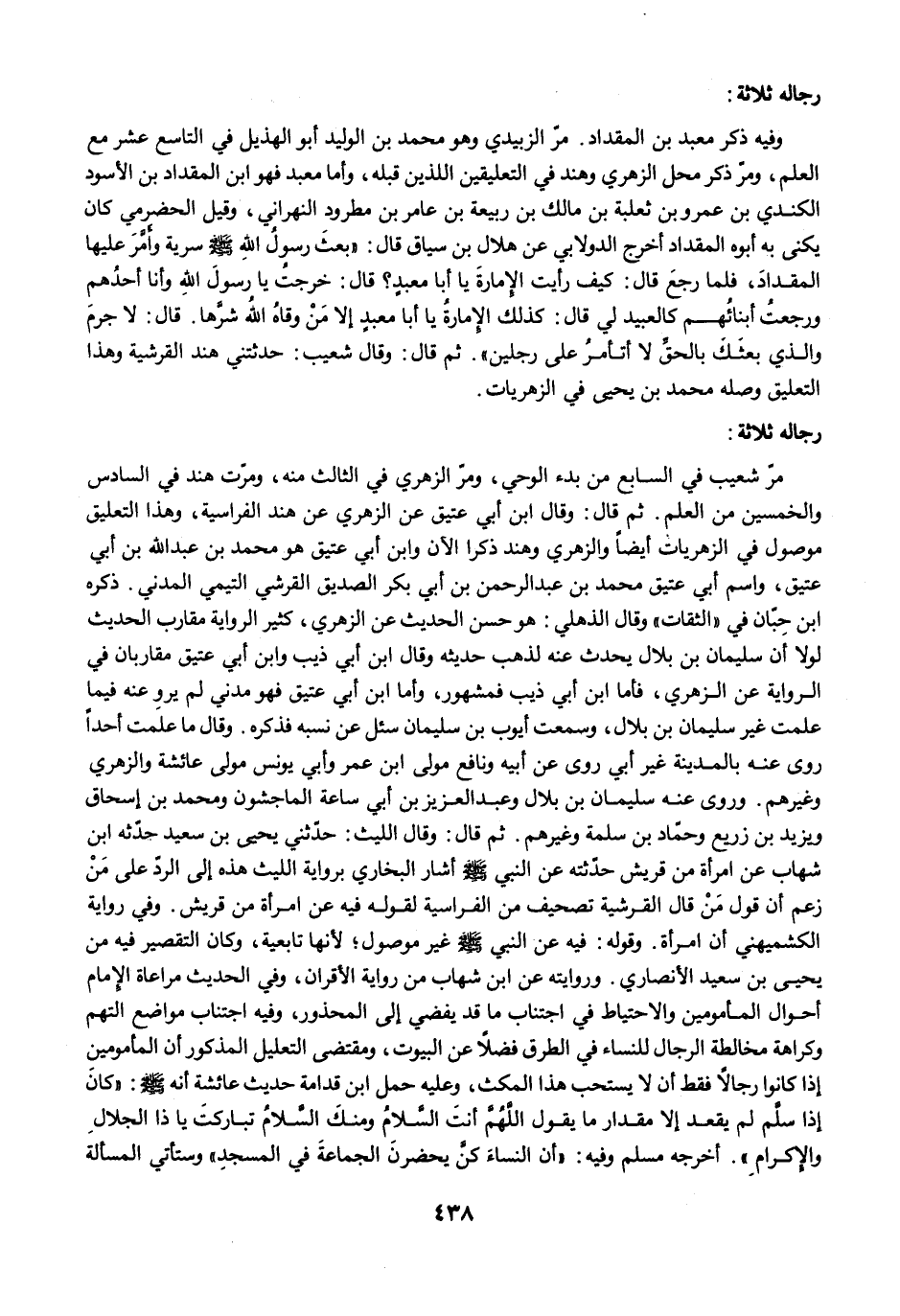 وفيه ذكر معبد بن المقداد. مرّ الزبيدي وهو محمد بن الوليد أبو الهذيل في التاسع عشر مع العلم، ومرّ ذكر محل الزهري وهند في التعليقين اللذين قبله، وأما معبد فهو ابن المقداد بن الأسود الكندي بن عمرو بن ثعلبة بن مالك بن ربيعة بن عامر بن مطرود النهراني، وقيل الحضرمي كان يكنى به أبوه المقداد أخرج الدولابي عن هلال بن سياق قال: "بعثَ رسولُ اللهِ -صلى الله عليه وسلم- سرية وأَمَّرَر عليها المقدادَ، فلما رجعَ قال: كيف رأيت الإمارةَ يا أبا معبدٍ؟ قال: خرجت يا رسولَ اللهِ وأنا أحدُهم ورجعتُ أبنائُهم كالعبيد لي قال: كذلك الإمارةُ يا أبا معبدٍ إلا مَنْ وقاهُ الله شرَّها. قال: لا جرمَ والذي بعثَكَ بالحقِّ لا أتأمرُ على رجلين". ثم قال: وقال شعيب: حدثتني هند القرشية وهذا التعليق وصله محمد بن يحيى في الزهريات.