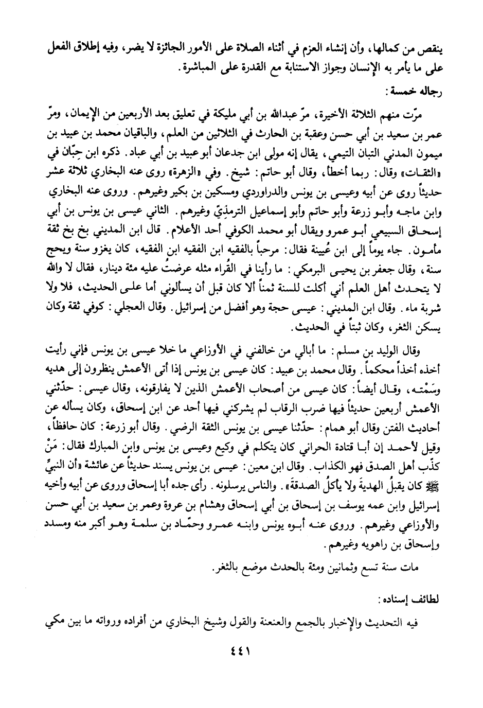 مرّت منهم الثلاثة الأخيرة، مرّ عبد الله بن أبي مليكة في تعليق بعد الأربعين من الإيمان، ومرّ عمر بن سعيد بن أبي حسن وعقبة بن الحارث في الثلاثين من العلم، والباقيان محمد بن عبيد بن ميمون المدني التبان التيمي، يقال إنه مولى ابن جدعان أبو عبيد بن أبي عباد. ذكره ابن حِبّان في "الثقات" وقال: ربما أخطأ، وقال أبو حاتم: شيخ. وفي "الزهرة" روى عنه البخاري ثلاثة عشر حديثًا روى عن أبيه وعيسى بن يونس والدراوردي ومسكين بن بكير وغيرهم. وروى عنه البخاري وابن ماجه وأبو زرعة وأبو حاتم وأبو إسماعيل الترمذِيّ وغيرهم. الثاني عيسى بن يونس بن أبي إسحاق السبيعي أبو عمرو ولقال أبو محمد الكوفي أحد الأعلام. قال ابن المديني بخ بخ ثقة مأمون. جاء يومًا إلى ابن عُيينة فقال: مرحبًا بالفقيه ابن الفقيه ابن الفقيه، كان يغزو سنة ويحج سنة، وقال جعفر بن يحيى البرمكي: ما رأينا في القُراء مثله عرضت عليه مئة دينار، فقال لا والله لا يتحدث أهل العلم أني أكلت للسنة ثمنًا ألا كان قبل أن يسألوني أما على الحديث، فلا ولا شربة ماء. وقال ابن المديني: عيسى حجة وهو أفضل من إسرائيل. وقال العجلي: كوفي ثقة وكان يسكن الثغر، وكان ثبتًا في الحديث.