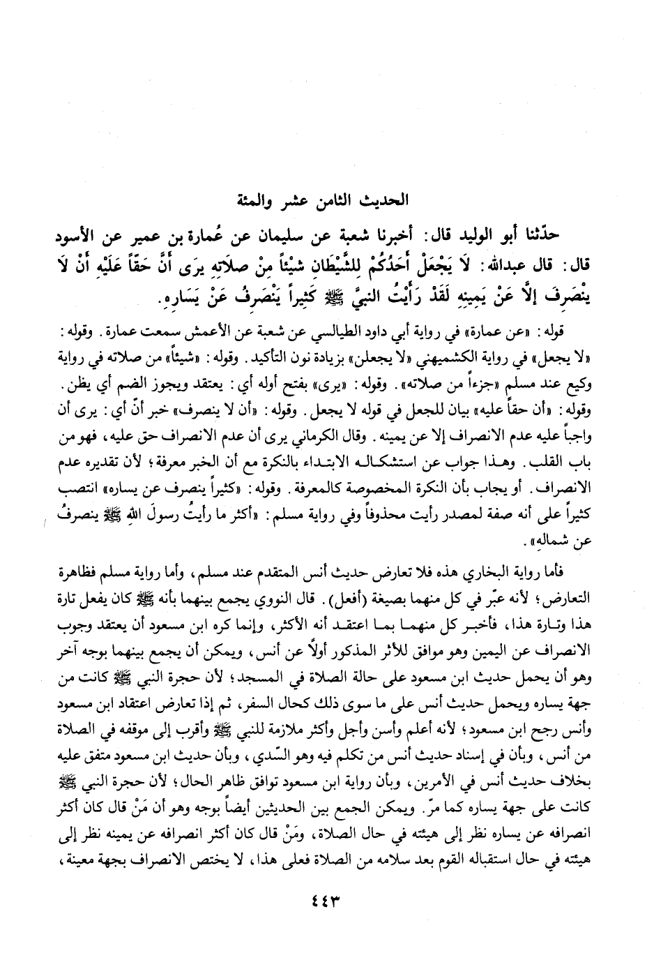 حَدَّثَنَا أَبُو الْوَلِيدِ قَالَ: أخبرنا شُعْبَةُ عَنْ سُلَيْمَانَ عَنْ عُمَارَةَ بْنِ عُمَيْرٍ عَنِ الأَسْوَدِ قَالَ: قَالَ عَبْدُ اللَّهِ: لاَ يَجْعَلْ أَحَدُكُمْ لِلشَّيْطَانِ شَيْئًا مِنْ صَلاَتِهِ، يَرَى أَنَّ حَقًّا عَلَيْهِ أَنْ لاَ يَنْصَرِفَ إِلاَّ عَنْ يَمِينِهِ، لَقَدْ رَأَيْتُ النَّبِيَّ -صلى الله عليه وسلم- كَثِيرًا يَنْصَرِفُ عَنْ يَسَارِهِ.