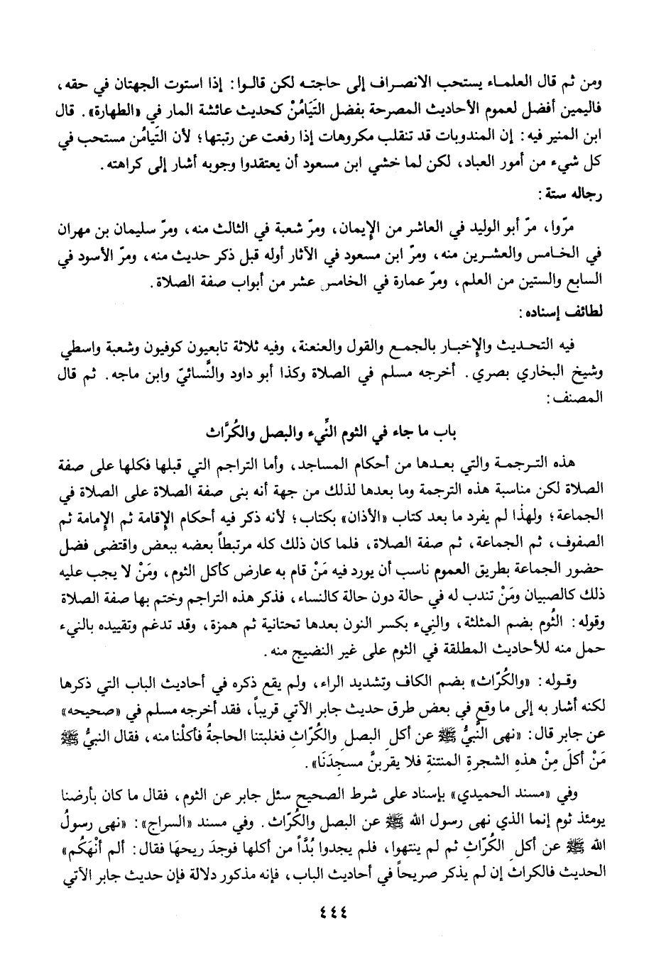 وفي "مسند الحميدي" بإسناد على شرط الصحيح سئل جابر عن الثوم، فقال ما كان بأرضنا يومئذ ثوم إنما الذي نهى رسول الله -صلى الله عليه وسلم- عن البصل والكُرّاث. وفي مسند "السراج": "نهى رسولُ الله -صلى الله عليه وسلم- عن أكلِ الكُرّاثِ ثم لم ينتهوا، فلم يجدوا بُدَّاً من أكلها فوجدَ ريحهَا فقال: ألم أنْهَكُم" الحديث فالكراث إن لم يذكر صريحًا في أحاديث الباب، فإنه مذكور دلالة فإن حديث جابر الآتي