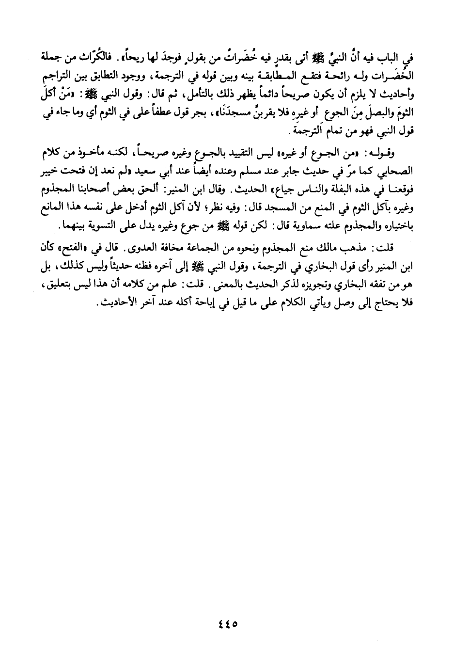 في الباب فيه أنَّ النبيَّ -صلى الله عليه وسلم- أتى بقدرٍ فيه خُضَراتٌ من بقولٍ فوجدَ لها ريحًا". فالكُرّاث من جملة الخُضَرات وله رائحة فتقع المطابقة بينه وبين قوله في الترجمة، ووجود التطابق بين التراجم وأحاديث لا يلزم أن يكون صريحًا دائمًا يظهر ذلك بالتأمل، ثم قال: وقول النبي -صلى الله عليه وسلم-: "مَنْ أكلَ الثومَ والبصلَ مِنَ الجوع أو غيرِهِ فلا يقربنَّ مسجدَنَا"، بجر قول عطفًا على في الثوم أي وما جاء في قول النبي فهو من تمام الترجمة.
