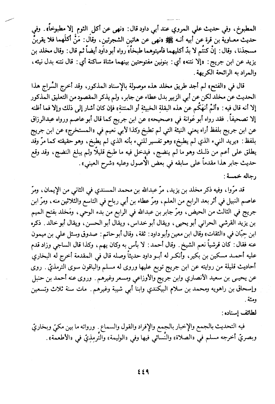 قال في " الفتح" لم أجد طريق مخلد هذه موصولة بالإسناد المذكور، وقد أخرج السَّراج هذا الحديث عن مخلد لكن عن أبي الزبير بدل عطاء عن جابر، ولم يذكر المقصود من التعليق المذكور إلا أنه قال فيه: "ألمْ أنهَكُم عن هذه البقلةِ الخبيثةِ أو المنتنةِ" فإن كان أشار إلى ذلك وإلا فما أظنه إلا تصحيفًا. فقد رواه أبو عَوانة في "صحيحه" عن ابن جريج كما قال أبو عاصم ورواه عبد الرزاق عن ابن جريج بلفظ أراه يعني النيئة التي لم تطبخ وكذا لأبي نعيم في "المستخرج" عن ابن جريج بلفظ: "يريد النيء الذي لم يطبخ" وهو تفسير للنيء بأنه الذي لم يطبخ، وهو حقيقته كما مرّ وقد يطلق على أعم من ذلك وهو ما لم ينضج، فيدخل فيه ماطبخ قليلاً ولم يبلغ النضج، وقد وقع حديث جابر هذا مقدمًا على سابقه في بعض الأصول وعليه "شرح العيني".
