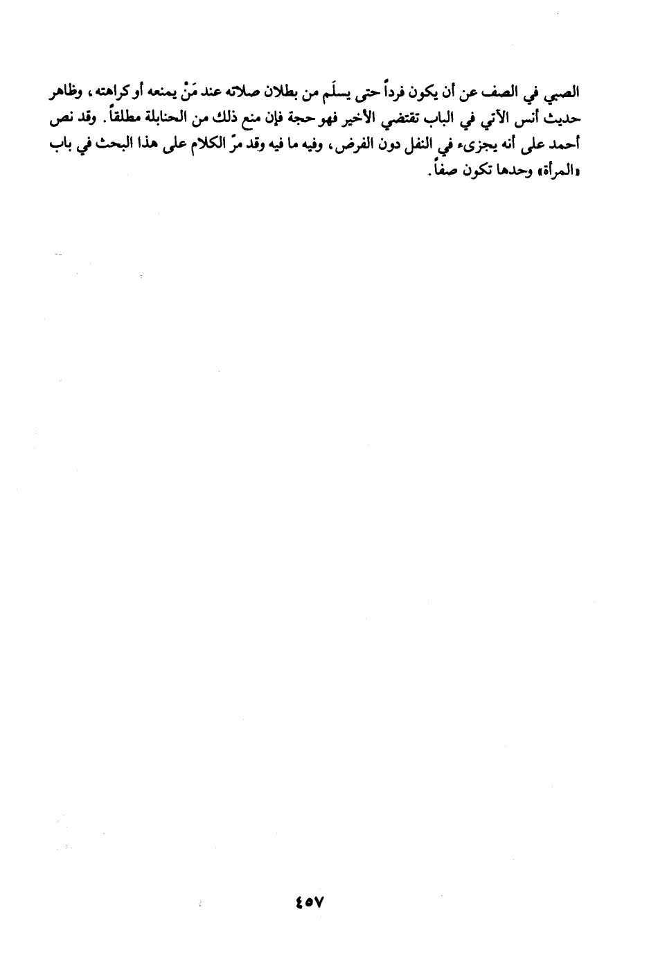 الصبي في الصف عن أن يكون فردًا حتى يسلَم من بطلان صلاته عند مَنْ يمنعه أو كراهته، وظاهر حديث أنس الآتي في الباب تقتضي الأخير فهو حجة فإن منع ذلك من الحنابلة مطلقًا. وقد نص أحمد على أنه يجزىء في النفل لون الفرض، وفيه ما فيه وقد مرّ الكلام على هذا البحث في باب "المرأة" وحدها تكون صفًا.