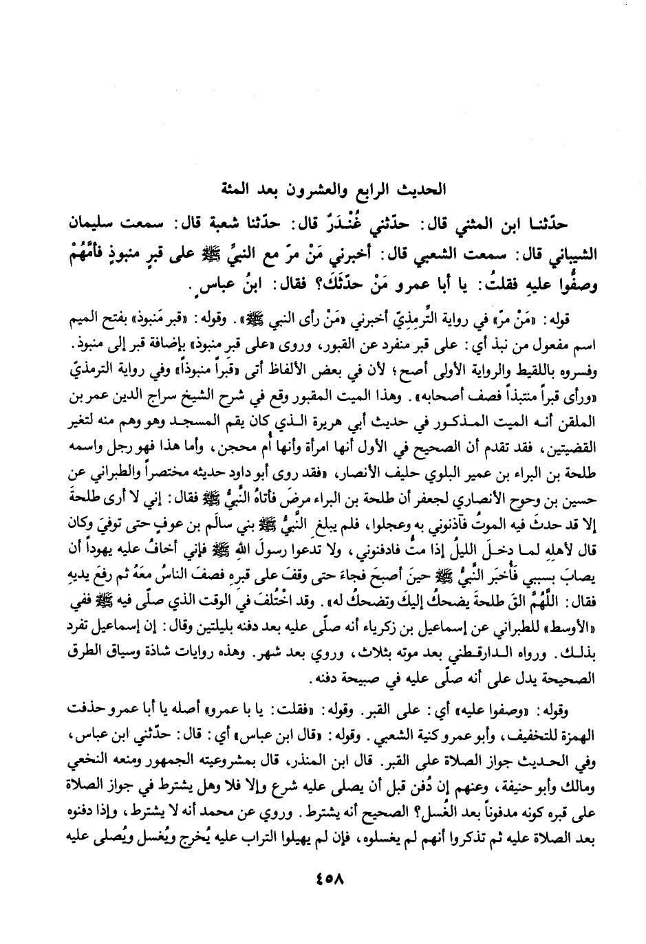 حَدَّثَنَا ابْنُ الْمُثَنَّى قَالَ: حَدَّثَنِي غُنْدَرٌ قَالَ: حَدَّثَنَا شُعْبَةُ قَالَ: سَمِعْتُ سُلَيْمَانَ الشَّيْبَانِيَّ قَالَ: سَمِعْتُ الشَّعْبِيَّ قَالَ: أَخْبَرَنِي مَنْ مَرَّ مَعَ النَّبِيِّ -صلى الله عليه وسلم- عَلَى قَبْرٍ مَنْبُوذٍ، فَأَمَّهُمْ وَصَفُّوا عَلَيْهِ فَقُلْتُ: يَا أَبَا عَمْرٍو مَنْ حَدَّثَكَ؟ فَقَالَ: ابْنُ عَبَّاسٍ.