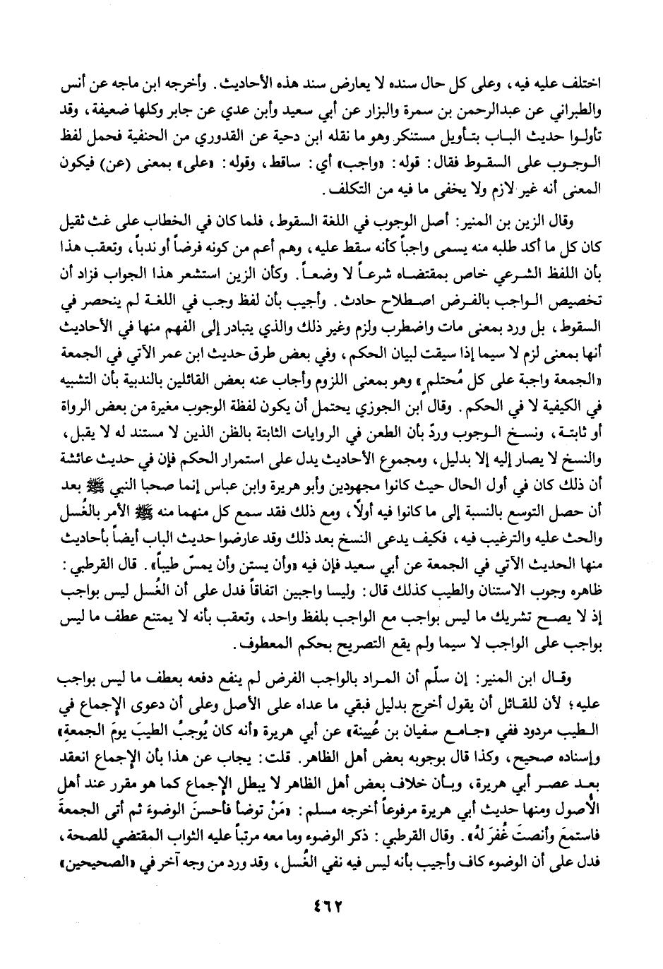 وقال الزين بن المنير: أصل الوجوب في اللغة السقوط، فلما كان في الخطاب على غث ثقيل كان كل ما أكد طلبه منه يسمى واجبًا كأنه سقط عليه، وهم أعم من كونه فرضًا أو ندبًا، وتعقب هذا بأن اللفظ الشرعي خاص بمقتضاه شرعًا لا وضعًا. وكأن الزين استشعر هذا الجواب فزاد أن تخصيص الواجب بالفرض اصطلاح حادث. وأجيب بأن لفظ وجب في اللغة لم ينحصر في السقوط، بل ورد بمعنى مات واضطرب ولزم وغير ذلك والذي يتبادر إلى الفهم منها في الأحاديث أنها بمعنى لزم لاسيما إذا سيقت لبيان الحكم، وفي بعض طرق حديث ابن عمر الآتي في الجمعة "الجمعة واجبة على كل مُحتلمٍ" وهو بمعنى اللزوم وأجاب عنه بعض القائلين بالندبية بأن التشبيه في الكيفية لا في الحكم. وقال ابن الجوزي يحتمل أن يكون لفظة الوجوب مغيرة من بعض الرواة أو ثابتة، ونسخ الوجوب وردّ بأن الطعن في الروايات الثابتة بالظن الذين لا مستند له لا يقبل، والنسخ لا يصار إليه إلابدليل، ومجموع الأحاديث يدل على استمرار الحكم فإن في حديث عائشة أن ذلك كان في أول الحال حيث كانوا مجهودين وأبو هريرة وابن عباس إنما صحبا النبي -صلى الله عليه وسلم- بعد أن حصل التوسع بالنسبة إلى ما كانوا فيه أولًا، ومع ذلك فقد سمع كل منهما منه -صلى الله عليه وسلم- الأمر بالغُسل والحث عليه والترغيب فيه، فكيف يدعى النسخ بعد ذلك وقد عارضوا حديث الباب أيضًا بأحاديث منها الحديث الآتي في الجمعة عن أبي سعيد فإن فيه "وأن يستن وأن يمسّ طيبًا". قال القرطبي: ظاهره وجوب الاستنان والطيب كذلك قال: وليسا واجبين اتفاقًا فدل على أن الغُسل ليس بواجب إذ لا يصح تشريك ما ليس بواجب مع الواجب بلفظ واحد، وتعقب بأنه لا يمتنع عطف ما ليس بواجب على الواجب لاسيما ولم يقع التصريح بحكم المعطوف.
