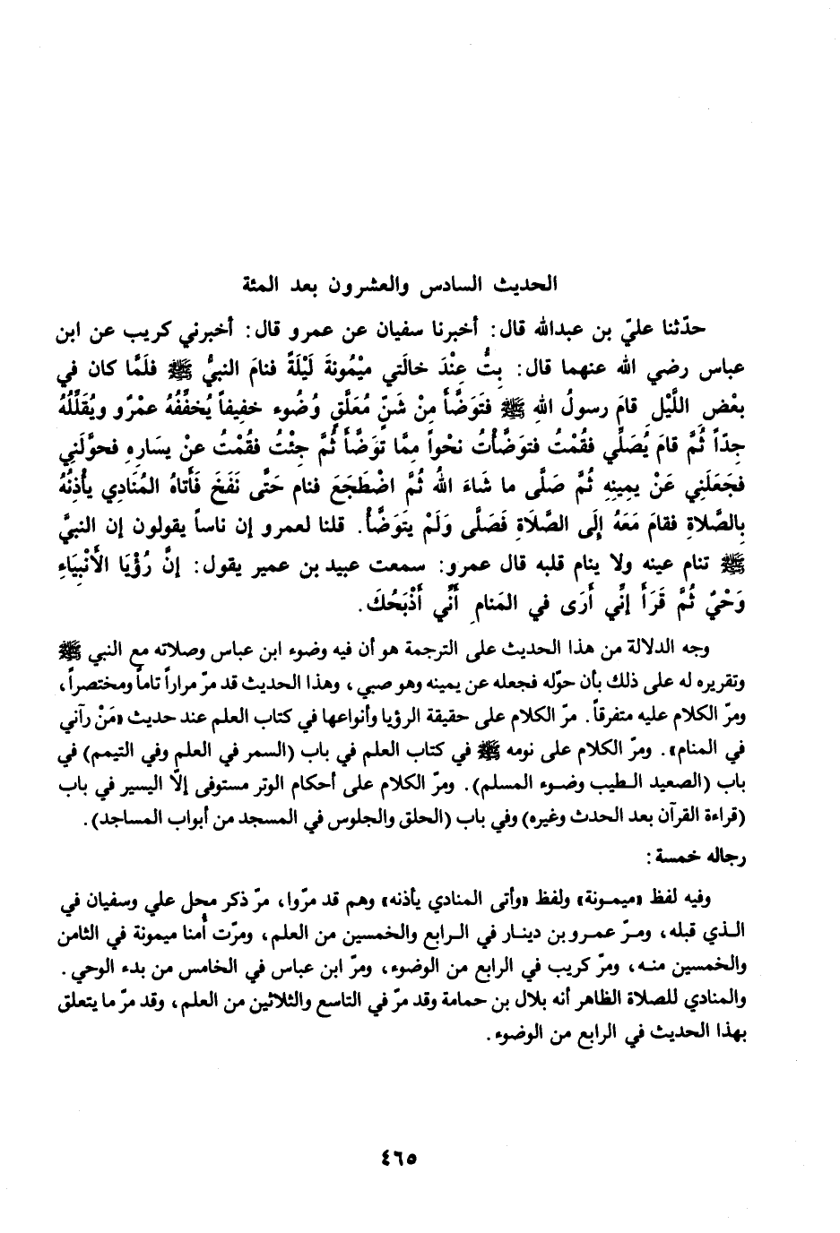 وفيه لفظ "ميمونة" ولفظ "وأتى المنادي يأذنه" وهم قد مرّوا، مرّ ذكر محل علي وسفيان في الذي قبله، ومرَّ عمرو بن دينار في الرابع والخمسين من العلم، ومرّت أُمنا ميمونة في الثامن والخمسين منه، ومرّ كريب في الرابع من الوضوء ومرّ ابن عباس في الخامس من بدء الوحي. والمنادي للصلاة الظاهر أنه بلال بن حمامة وقد مرّ في التاسع والثلاثين من العلم، وقد مرّ ما يتعلق بهذا الحديث في الرابع من الوضوء.