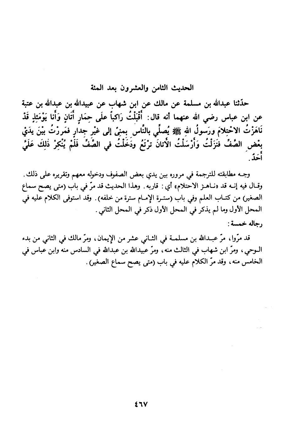قد مرّوا، مرّ عبد الله بن مسلمة في الثاني عشر من الإيمان، ومرّ مالك في الثاني من بدء الوحي، ومرّ ابن شهاب في الثالث منه، ومرّ عبيد الله بن عبد الله في السادس منه وابن عباس في الخامس منه، وقد مرّ الكلام عليه في باب (متى يصح سماع الصغير).