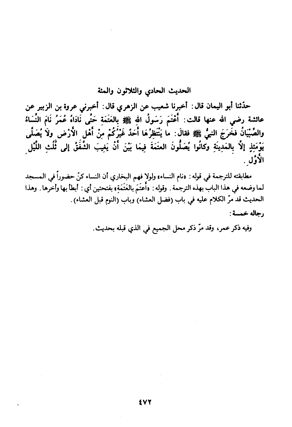 حَدَّثَنَا أَبُو الْيَمَانِ قَالَ: أَخْبَرَنَا شُعَيْبٌ عَنِ الزُّهْرِيِّ قَالَ: أَخْبَرَنِي عُرْوَةُ بْنُ الزُّبَيْرِ عَنْ عَائِشَةَ رضي الله عنها قَالَتْ: أَعْتَمَ رَسُولُ اللَّهِ -صلى الله عليه وسلم- بِالْعَتَمَةِ حَتَّى نَادَاهُ عُمَرُ نَامَ النِّسَاءُ وَالصِّبْيَانُ. فَخَرَجَ النَّبِيُّ -صلى الله عليه وسلم- فَقَالَ: مَا يَنْتَظِرُهَا أَحَدٌ غَيْرُكُمْ مِنْ أَهْلِ الأَرْضِ. وَلاَ يُصَلَّي يَوْمَئِذٍ إِلاَّ بِالْمَدِينَةِ، وَكَانُوا يُصَلُّونَ الْعَتَمَةَ فِيمَا بَيْنَ أَنْ يَغِيبَ الشَّفَقُ إِلَى ثُلُثِ اللَّيْلِ الأَوَّلِ.