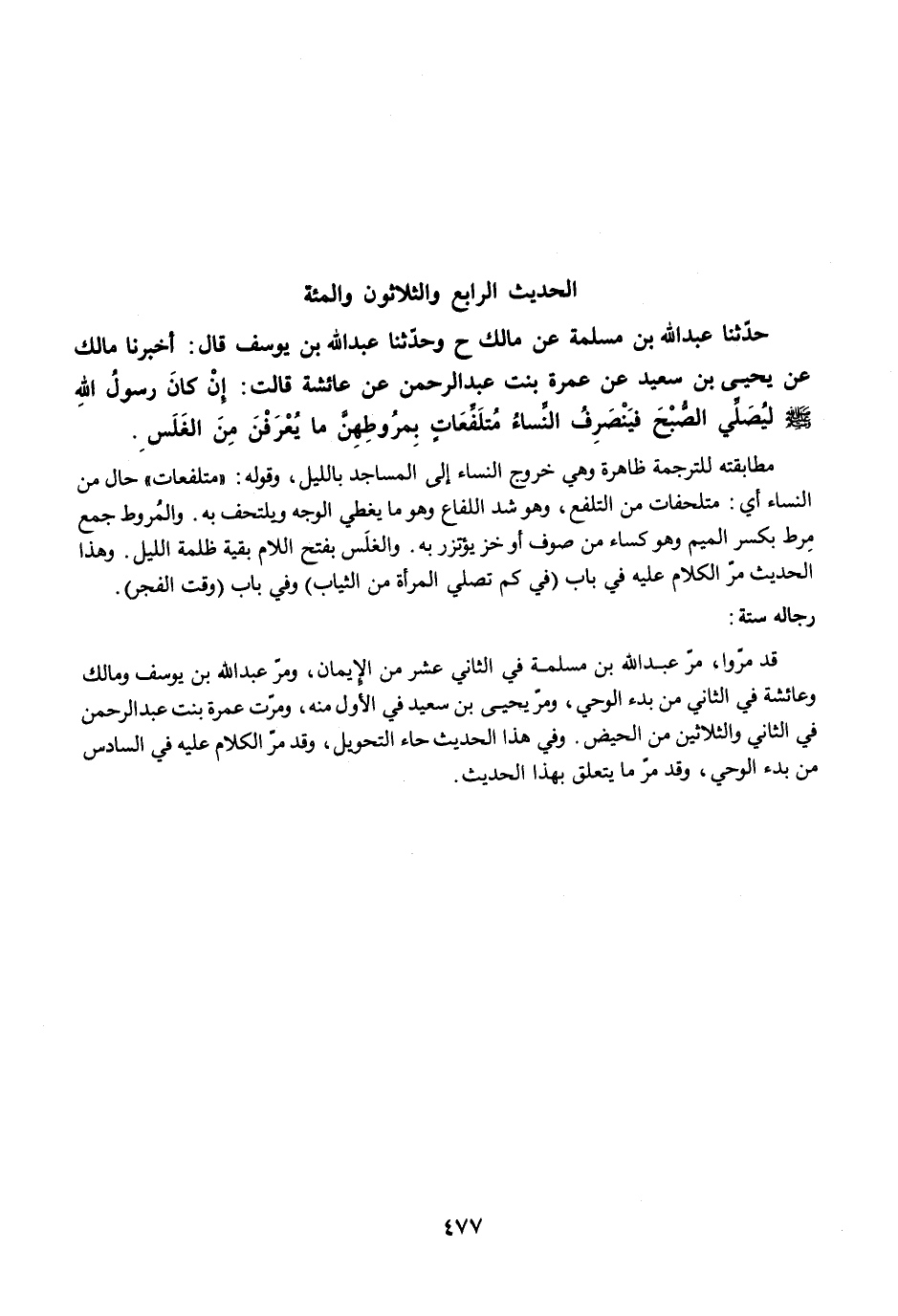 حَدَّثَنَا عَبْدُ اللَّهِ بْنُ مَسْلَمَةَ عَنْ مَالِكٍ ح وَحَدَّثَنَا عَبْدُ اللَّهِ بْنُ يُوسُفَ قَالَ: أَخْبَرَنَا مَالِكٌ عَنْ يَحْيَى بْنِ سَعِيدٍ عَنْ عَمْرَةَ بِنْتِ عَبْدِ الرَّحْمَنِ عَنْ عَائِشَةَ قَالَتْ: إِنْ كَانَ رَسُولُ اللَّهِ -صلى الله عليه وسلم- لَيُصَلِّي الصُّبْحَ، فَيَنْصَرِفُ النِّسَاءُ مُتَلَفِّعَاتٍ بِمُرُوطِهِنَّ، مَا يُعْرَفْنَ مِنَ الْغَلَسِ.