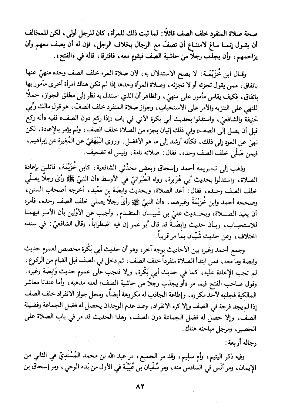 وقال ابن خُزَيْمَة: لا يصح الاستدلال به, لأن صلاة المرء خلف الصف وحده منهيّ عنها باتفاق، ممن يقول تجزئه أو لا تجزئه، وصلاة المرأة وحدها إذا لم تكن هناك امرأة أخرى مأمور بها باتفاق، فكيف يقاس مأمور على منهيّ، والظاهر أن الذي استدل به نظر إلى مطلق الجواز، حملًا للنهي على التنزيه والأمر على الاستحباب، وجواز صلاة المنفرد خلف الصف , هو قول مالك وأبي حَنِيفة والشافعيّ، واستدلوا بحديث أبي بكرة الآتي في باب "إذا ركع دون الصف" ففيه "أنه ركع قبل أن يصل إلى الصف"وفي ذلك إتيان بجزء من الصلاة خلف الصف, ولم يؤمر بالإعادة، لكن نهى عن العود إلى ذلك، فكأنه أرشد إلى ما هو الأفضل. وروى البَيْهَقيّ عن المُغِيرة عن إبراهيم، فيمن صَلّى خلف الصف وحده، فقال: صلاته تامة، وليس له تضعيف.