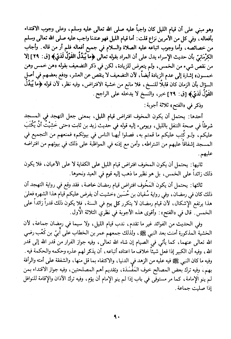 ثالثها: يحتمل أن يكون المَخُوف افتراض قيام رمضان خاصة، فقد وقع في رواية التهجد أن ذلك كان في رمضان، وفي رواية سُفيان بن حُسَين "خشيت أن يفرض عليكم قيام هذا الشهر" فعلى هذا يرتفع الإشكال, لأن قيام رمضان لا يتكرر كل يوم في السنة، فلا يكون ذلك قدرًا زائداً على الخمس. قال في "الفتح": وأقوى هذه الأجوبة في نظري الثلاثة الأُول.