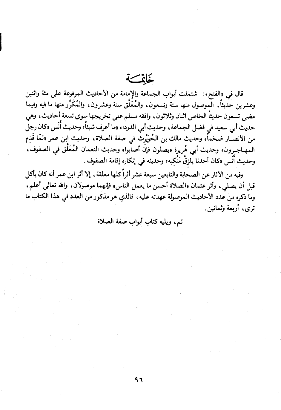قال في "الفتح": اشتملت أبواب الجماعة والإِمامة من الأحاديث المرفوعة على مئة واثنين وعشرين حديثًا، الموصول منها ستة وتسعون، والمُعَلَّق ستة وعشرون، والمُكَرَّر منها ما فيه وفيما مضى تسعون حديثًا الخاص اثنان وثلاثون، وافقه مسلم على تخريجها سوى تسعة أحاديث، وهي حديث أبي سعيد في فضل الجماعة، وحديث أبي الدرداء "ما أعرف شيئًا" وحديث أَنَس "كان رجل من الأنصار ضخماً" وحديث مالك بن الحُوَيْرث في صفة الصلاة، وحديث ابن عمر "لمّا قَدِم المهاجرون" وحديث أبي هُريرة "يصلون فإن أصابوا" وحديث النعمان المُعَلَّق في الصفوف، وحديث أَنَس "كان أحدنا يلزِقْ مَنْكِبه" وحديثه في إنكاره إقامة الصفوف.
