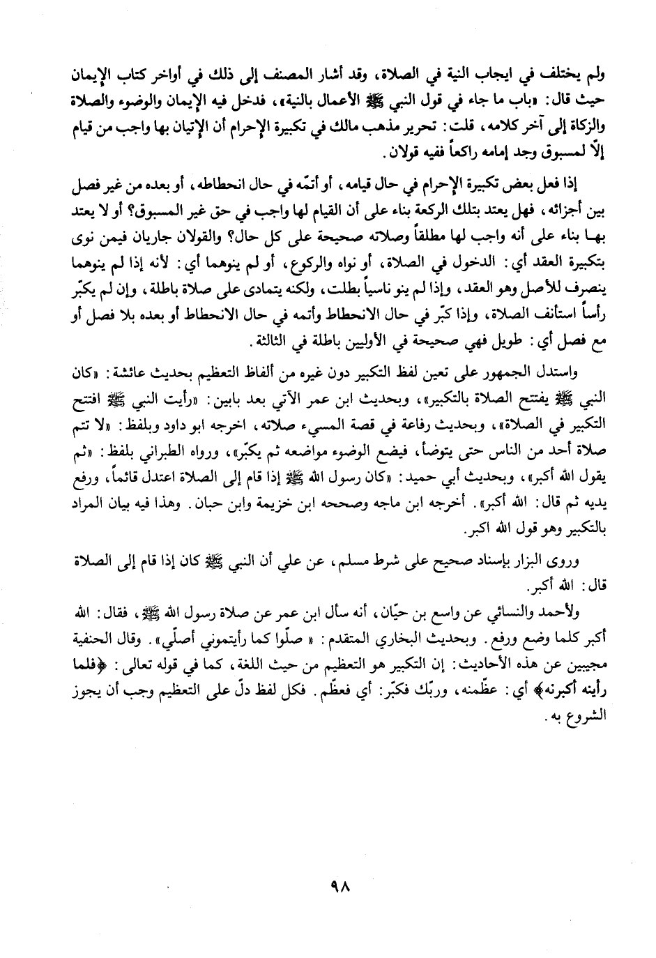 ولم يختلف في ايجاب النية في الصلاة، وقد أشار المصنف إلى ذلك في أواخر كتاب الإيمان حيث قال: "باب ما جاء في قول النبي -صلى الله عليه وسلم- الأعمال بالنية"، فدخل فيه الإيمان والوضوء والصلاة والزكاة إلى آخر كلامه، قلت: تحرير مذهب مالك في تكبيرة الإحرام ان الإتيان بها واجب من قيام إلاَّ لمسبوق وجد إمامه راكعًا ففيه قولان.