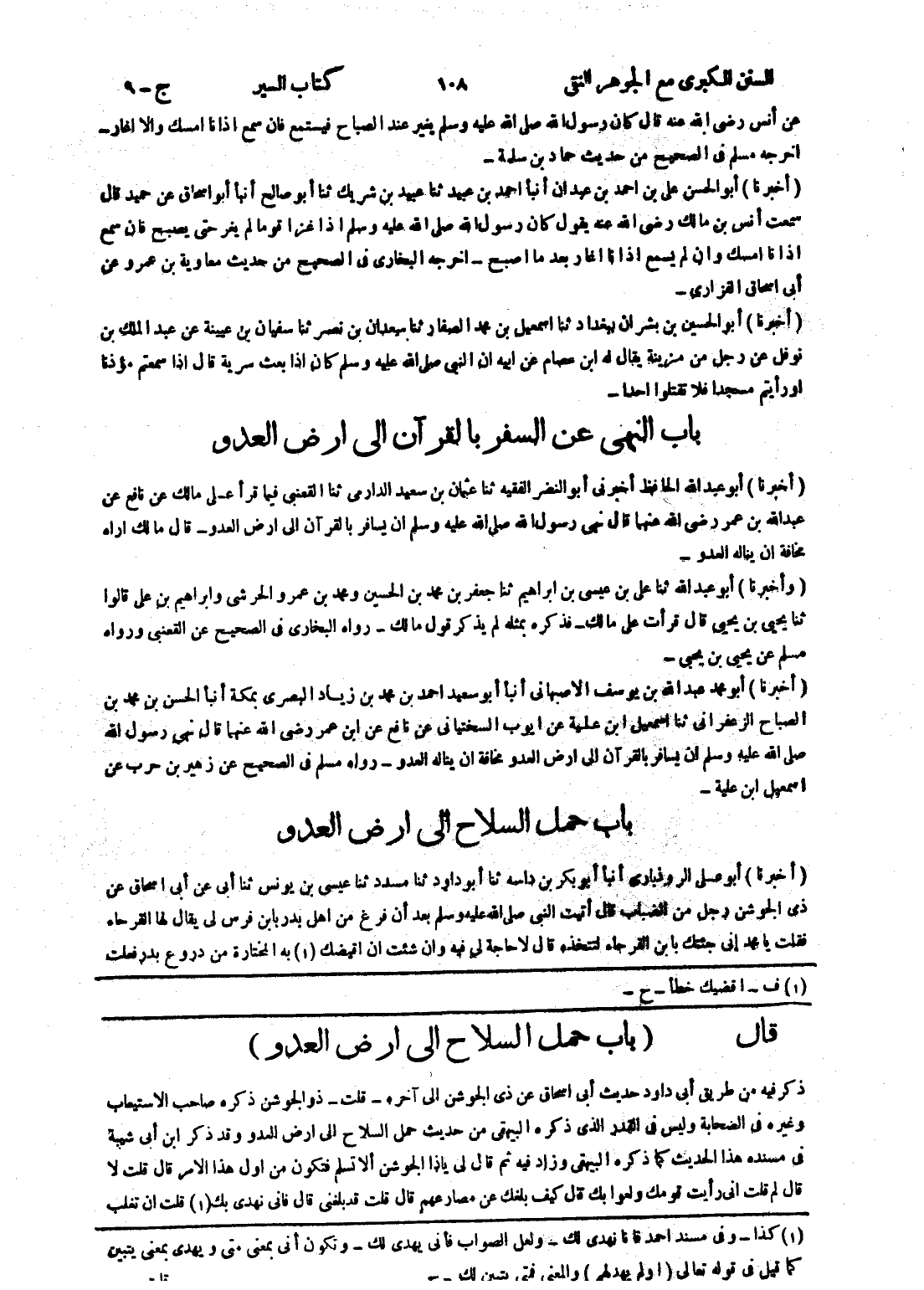 [قال (باب حمل السلاح إلى ارض العدو) ذكر فيه من طريق أبى داود حديث أبى اسحاق عن ذى الجوشن إلى آخره - قلت - ذو الجوشن ذكره صاحب الاستيعاب وغيره في الصحابة وليس في القدر الذى ذكره البيهقى من حديث حمل السلاح إلى ارض العدو وقد ذكر ابن أبى شيبة في مسنده هذا الحديث كما ذكره البيهقى وزاد فيه ثم قال لى يا ذا الجوشن ألا تسلم فتكون من اول هذا الامر قال قلت لا قال لم قلت انى رأيت قومك ولعوابك قال كيف بلغك عن مصارعهم قال قلت قد بلغني قال فانى نهدى بك (1) قلت ان تغلب