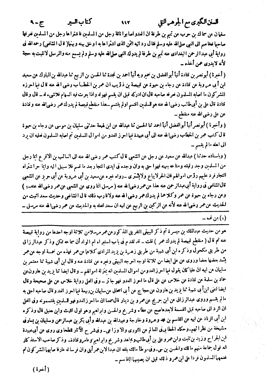 [هو من حديث عبد الملك بن ميسرة ثم ذكر البيهقى التفريق المذكور عن عمر مرسلا من ثلاثة اوجه احدها من رواية قبيصة عنه ثم قال (منقطع قبيصة لم يدرك عمر) قلت - قد تقدم في باب استبراء ام الولد أن سماعه ممكن وذكر عبد الرزاق من طريق مكحول وذكره ابن أبى شيبة من طريق زهرة بن يزيد المرادى كلاهما عن عمر فهذه من خمسة اوجه عن عمر يشد بعضها بعضا وروى عن على ايضا من ثلاثة اوجه اخرجه البيهقى وغيره عن قتادة عنه وقال ابن أبى شيبة ثنا معتمر بن سليمان عن ابيه ان عليا كان يقول فيما احرز العدو من اموال المسلمين انه بمنزلة اموالهم - وقال ايضا ثنا يزيد بن هارون عن