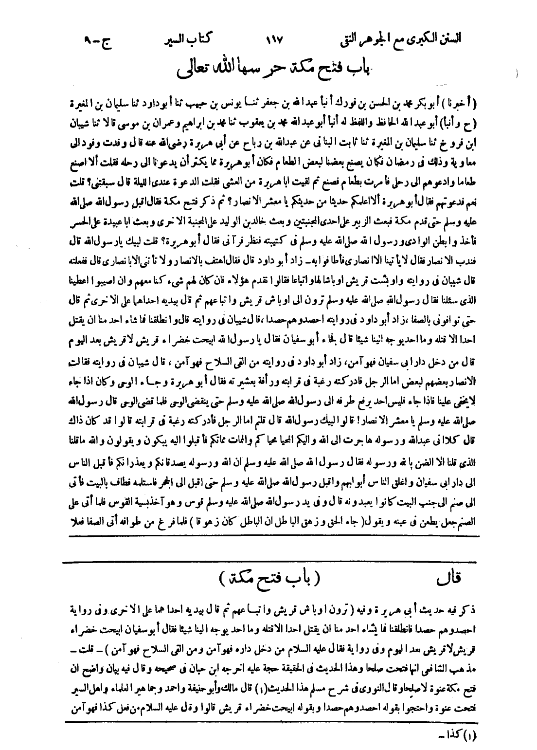 [قال (باب فتح مكة) ذكر فيه حديث أبى هريرة وفيه (ترون اوباش قريش واتباعهم ثم قال بيديه احداهما على الاخرى وفى رواية احصدوهم حصدا فانطلقنا فما يشاء احد منا ان يقتل احدا الا قتله وما احد يوجه الينا شيئا فقال أبو سفيان ابيحت خضراء قريش لا قريش بعد اليوم وفى رواية فقال عليه السلام من دخل داره فهو آمن ومن القى السلاح فهو آمن) - قلت - مذهب الشافعي انها فتحت صلحا وهذا الحديث في الحقيقة حجة عليه اخرجه ابن حبان في صحيحه وقال فيه بيان واضح ان فتح مكة عنوة لا صلحا وقال النووي في شرح مسلم هذا الحديث (1) قال مالك وأبو حنيفة واحمد وجماهير العلماء واهل السير فتحت عنوة واحتجوا بقوله احصدوهم حصدا وبقوله ابيحت خضراء قريش قالوا وقال عليه السلام من فعل كذا فهو آمن