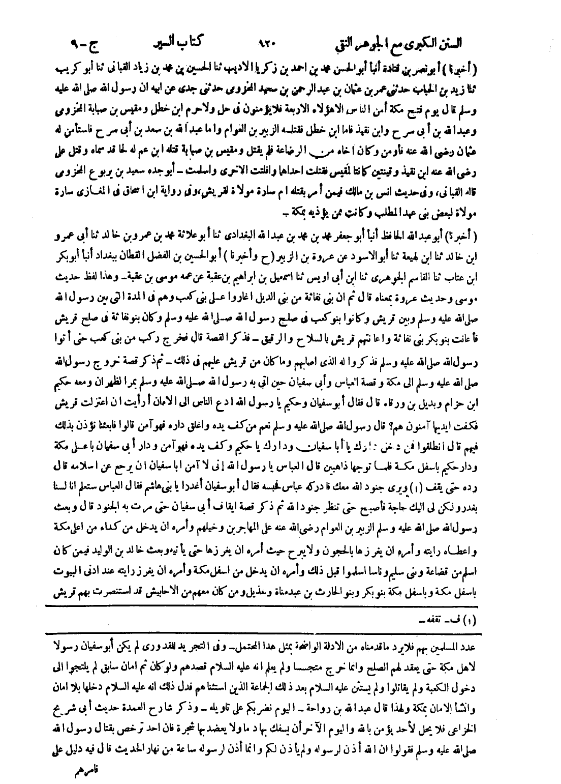 [عدد المسلمين بهم فلا يرد ما قدمناه من الادلة الواضحة بمثل هذا المحتمل - وفى التجريد للقدورى لم يكن أبو سفيان رسولا لاهل مكة حتى يعقد لهم الصلح وانما خرج متجسسا ولم يعلم انه عليه السلام قصدهم ولو كان ثم امان سابق لم يلتجوا إلى دخول الكعبة ولم يقاتلوا ولم يستثن عليه السلام بعد ذلك الجماعة الذين استثناهم فدل ذلك انه عليه السلام دخلها بلا امان وانشأ الامان بمكة ولهذا قال عبد الله بن رواحة - اليوم نضربكم على تأويله - وذكر شارح العمدة حديث أبى شريح لخزاعي فلا يحل لاحد يؤمن بالله واليوم الآخر أن يسفك بها دما ولا يعضد بها شجرة فان احد ترخص بقتال رسول الله صلى الله عليه وسلم فقولوا ان الله أذن لرسوله ولم يأذن لكم وانما أذن لرسوله ساعة من نهار الحديث قال فيه دليل على]