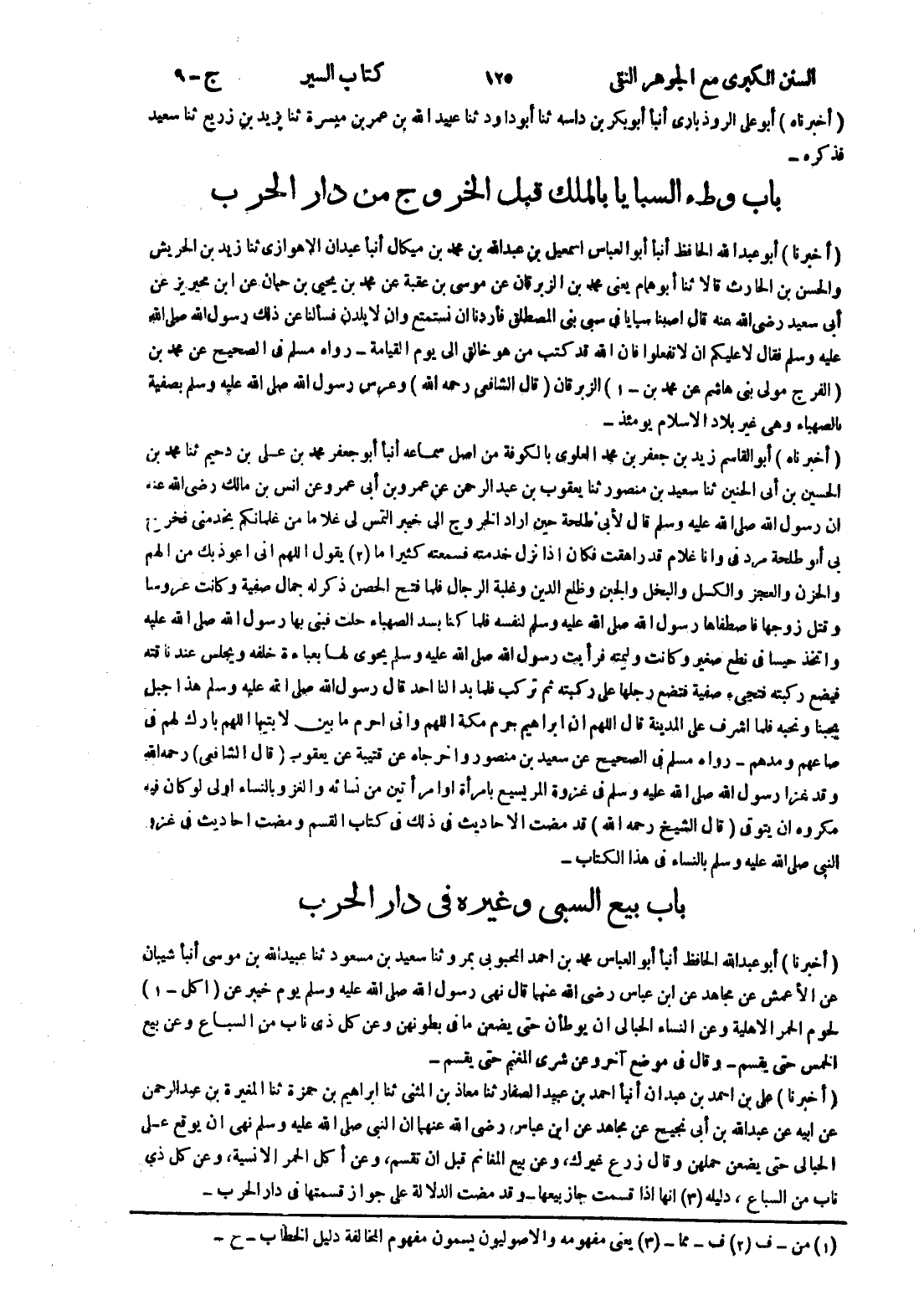 - (أخبرنا) على بن احمد بن عبدان أنبأ احمد بن عبيدالصفار ثنا معاذ بن المثنى ثنا ابراهيم بن حمزة ثنا المغيرة بن عبد الرحمن عن ابيه عن عبد الله بن أبى نجيح عن مجاهد عن ابن عباس رضى الله عنهما ان النبي صلى الله عليه وسلم نهى ان يوقع على الحبالى حتى يضعن حملهن وقال زرع غيرك ، وعن بيع المغانم قبل ان تقسم ، وعن أكل الحمر الانسية ، وعن كل ذى ناب من السباع ، دليله (3) انها إذا قسمت جاز بيعها - وقد مضت الدلالة على جواز قسمتها في دار الحرب -