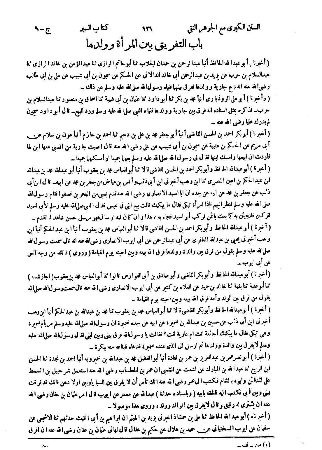 - (أخبرنا) أبو نصر عمر بن عبد العزيز بن عمر بن قتادة أنبأ أبو الفضل محمد بن عبد الله بن خميرويه أنبأ احمد بن نجدة ثنا الحسن ابن الربيع ثنا عبد الله بن المبارك عن اشعث عن الشعبى ان عمر بن الخطاب رضى الله عنه استعمل شرحبيل بن السمط على المدائن وابوه بالشام فكتب إلى عمر رضى الله عنه انك تأمر أن لا يفرق بين السبايا وبين اولادهن فانك قد فرقت بينى وبين أبى فكتب إليه فالحقه بابيه (وباسناده حدثنا) عبد الله عن معمر عن ايوب قال امر عثمان بن عفان رضى الله عنه ان يشترى له رقيق وقال لا يفرق بين الوالد وولده وروى هذا موصولا - (أخبرناه) أبو عبد الله الحافظ ثنا على بن حمشاذ اخبرني يزيد بن الهيثم ان ابراهيم بن أبى الليث حدثهم ثنا الاشجعى عن سفيان عن ايوب السختيانى عن حميد بن هلال عن حكيم بن عقال قال نهانى عثمان بن عفان رضى الله عنه ان افرق