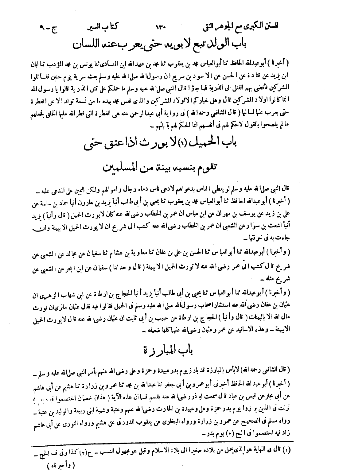 - (وأخبرنا) أبو عبد الله ثنا أبو العباس ثنا يحيى بن أبى طالب أنبأ يزيد أنبأ الحجاج بن ارطاة عن ابن شهاب الزهري ان عثمان بن عفان رضى الله عنه استشار اصحاب رسول الله صلى الله عليه وسلم في الحميل فقالوا فيه فقال عثمان ما نرى ان نورث مال الله الا بالبينات (قال وأنبأ) الحجاج بن ارطاة عن حبيب بن أبى ثابت ان عثمان رضى الله عنه قال لا يورث الحميل الا ببينة - وهذه الاسانيد عن عمر وعثمان رضى الله عنهما كلها ضعيفه