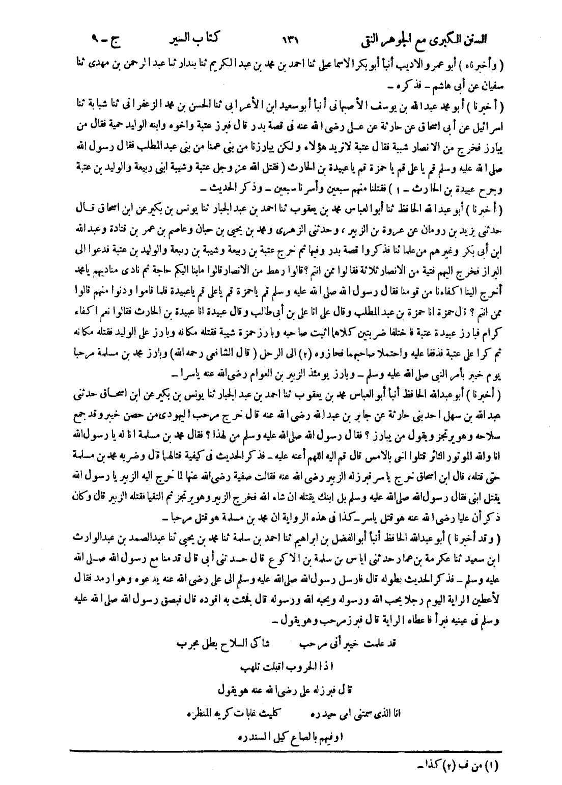 - (أخبرنا) أبو عبد الله الحافظ ثنا أبو العباس محمد بن يعقوب ثنا احمد بن عبد الجبار ثنا يونس بن بكير عن ابن اسحاق قال حدثنى يزيد بن رومان عن عروة بن الزبير ، وحدثني الزهري ومحمد بن يحيى بن حبان وعاصم بن عمر بن قتادة و عبد الله ابن أبى بكر وغيرهم من علمائنا فذكروا قصة بدر وفيها ثم خرج عتبة بن ربيعة وشيبة بن ربيعة والوليد بن عتبة فدعوا إلى البراز فخرج إليهم فتية من الانصار ثلاثة فقالوا ممن انتم ؟ قالوا رهط من الانصار قالوا ما بنا اليكم حاجة ثم نادى مناديهم يا محمد أخرج الينا اكفاءنا من قومنا فقال رسول الله صلى الله عليه وسلم قم يا حمزة قم يا علي قم يا عبيدة فلما قاموا ودنوا منهم قالوا ممن انتم ؟ قال حمزة انا حمزة بن عبد المطلب وقال علي انا علي بن أبي طالب وقال عبيدة انا عبيدة بن الحارث فقالوا نعم اكفاء كرام فبارز عبيدة عتبة فاختلفا ضربتين كلاهما اثبت صاحبه وبارز حمزة شيبة فقتله مكانه وبارز علي الوليد فقتله مكانه ثم كرا على عتبة فذففا عليه واحتملا صاحبهما فحازوه (2) إلى الرحل