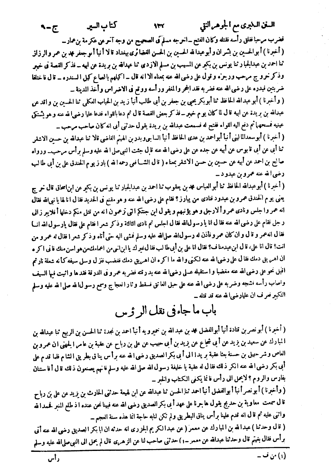 قال سمعت معاوية بن حديج يقول هاجرنا على عهد أبى بكر الصديق رضى الله عنه فبينا نحن عنده إذ طلع المنبر فحمد الله واثنى عليه ثم قال انه قدم علينا برأس يناق البطريق ولم تكن لنا به حاجة انما هذه سنة العجم - (قال وحدثنا) عبد الله بن المبارك عن معمر (عن عبد الكريم الجزرى انه حدثه انه ابا بكر الصديق رضى الله عنه أتى برأس فقال بغيتم قال وحدثنا عبد الله عن معمر - 1) حدثنى صاحب لنا عن الزهري قال لم يحمل إلى النبي صلى الله عليه وسلم