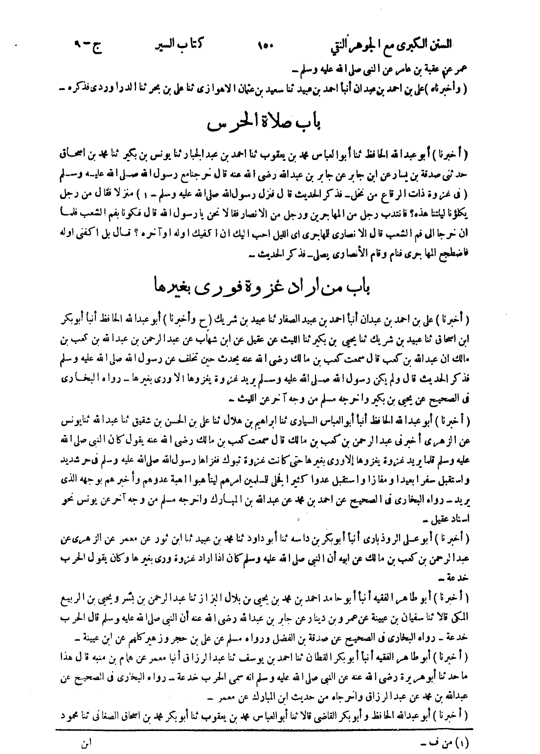 - (أخبرنا) أبو طاهر الفقيه أنبأ أبو حامد احمد بن محمد بن يحيى بن بلال البزاز ثنا عبد الرحمن بن بشر ويحيى بن الربيع المكى قالا ثنا سفيان بن عيينة عن عمرو بن دينار عن جابر بن عبد الله رضى الله عنه أن النبي صلى الله عليه وسلم قال الحرب خدعة - رواه البخاري في الصحيح عن صدقة بن الفضل ورواه مسلم عن على بن حجر وزهير كلهم عن ابن عيينة