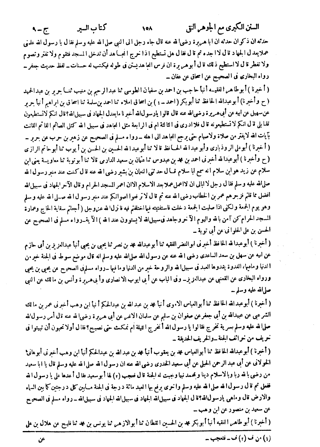 (ح وأخبرنا) أبو عبد الله الحافظ ثنا أبو بكر (احمد - 1) بن اسحاق املاء ثنا احمد بن سلمة ثنا اسحاق بن ابراهيم أنبأ جرير عن سهيل عن ابيه أبى هريرة رضى الله عنه قال قالوا يارسول الله أخبرنا ما يعدل الجهاد في سبيل الله ؟ قال انكم لا تستطيعون قلنا بلى قال انكم لا تستطيعونه قال فلا ادرى في الثالثة ام في الرابعة مثل المجاهد في سبيل الله كمثل الصائم القائم القانت بآيات الله لا يفتر من صلاة ولا صيام حتى يرجع المجاهد إلى اهله - رواه مسلم في الصحيح عن زهير بن حرب عن جرير