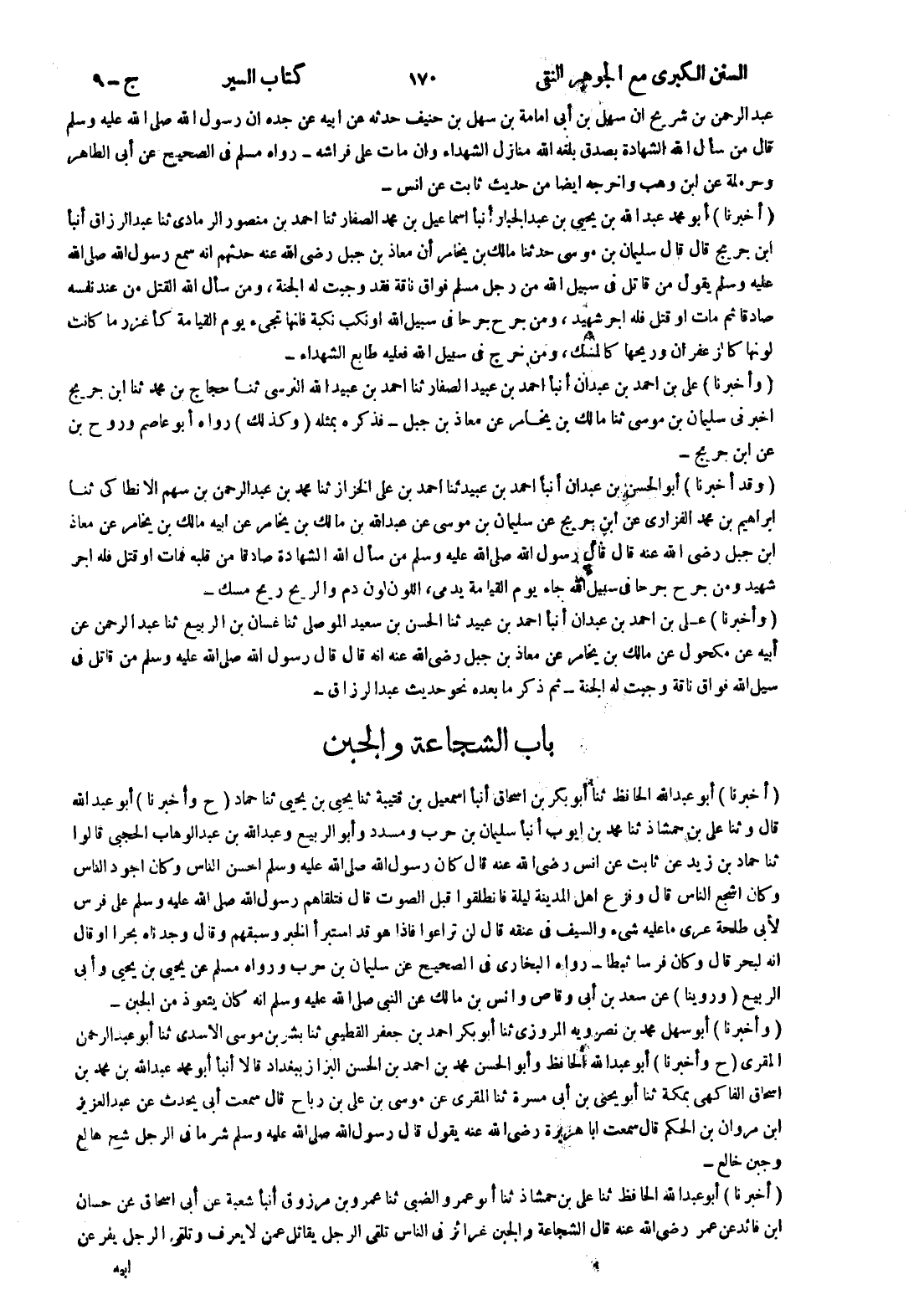 - (أخبرنا) أبو محمد عبد الله بن يحيى بن عبد الجبار أنبأ اسماعيل بن محمد الصفار ثنا احمد بن منصور الرمادي ثنا عبد الرزاق أنبأ ابن جريج قال قال سليمان بن موسى حدثنا مالك بن يخامر أن معاذ بن جبل رضى الله عنه حدثهم انه سمع رسول الله صلى الله عليه وسلم يقول من قاتل في سبيل الله من رجل مسلم فواق ناقة فقد وجبت له الجنة ، ومن سأل الله القتل من عند نفسه صادقا ثم مات أو قتل فله اجر شهيد ، ومن جرح جرحا في سبيل الله أو نكب نكبة فانها تجئ يوم القيامة كأغزر ما كانت