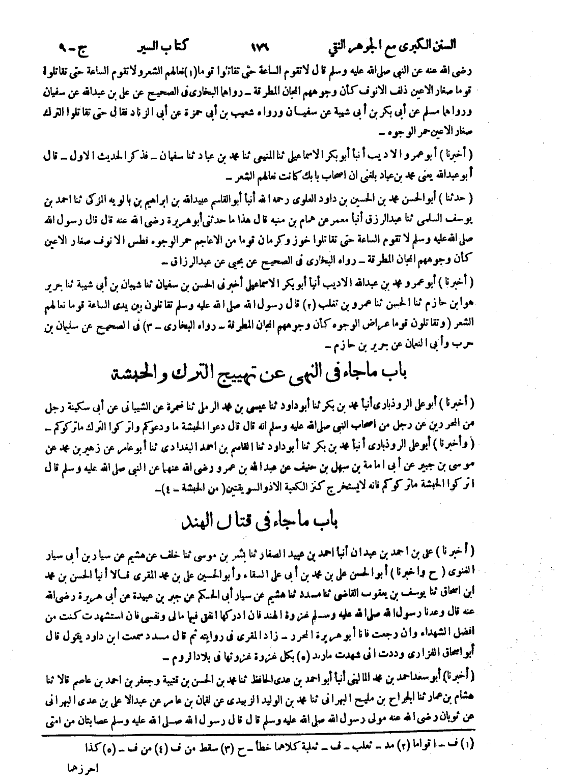 - (وأخبرنا) أبو على الروذبارى أنبأ محمد بن بكر ثنا أبو داود ثنا القاسم بن احمد البغدادي ثنا أبو عامر عن زهير بن محمد عن موسى بن جبير عن أبى امامة بن سهل بن حنيف عن عبد الله بن عمرو رضى الله عنهما عن النبي صلى الله عليه وسلم قال اتركوا الحبشة ما تركوكم فانه لا يستخرج كنز الكعبة الا ذو السويقتين (من الحبشة - 4) باب ما جاء في قتال الهند