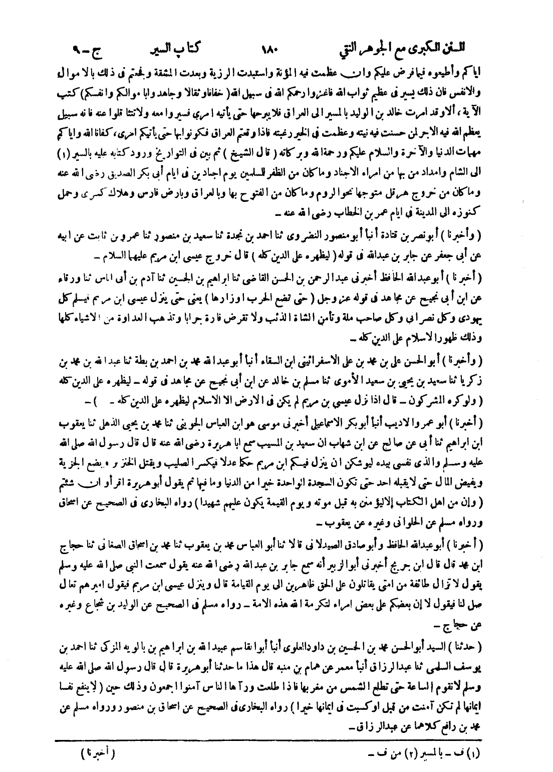 - (وأخبرنا) أبو نصر بن قتادة أنبأ أبو منصور النضروى ثنا احمد بن نجدة ثنا سعيد بن منصور ثنا عمرو بن ثابت عن ابيه عن أبى جعفر عن جابر بن عبد الله في قوله (ليظهره على الدين كله) قال خروج عيسى ابن مريم عليهما السلام