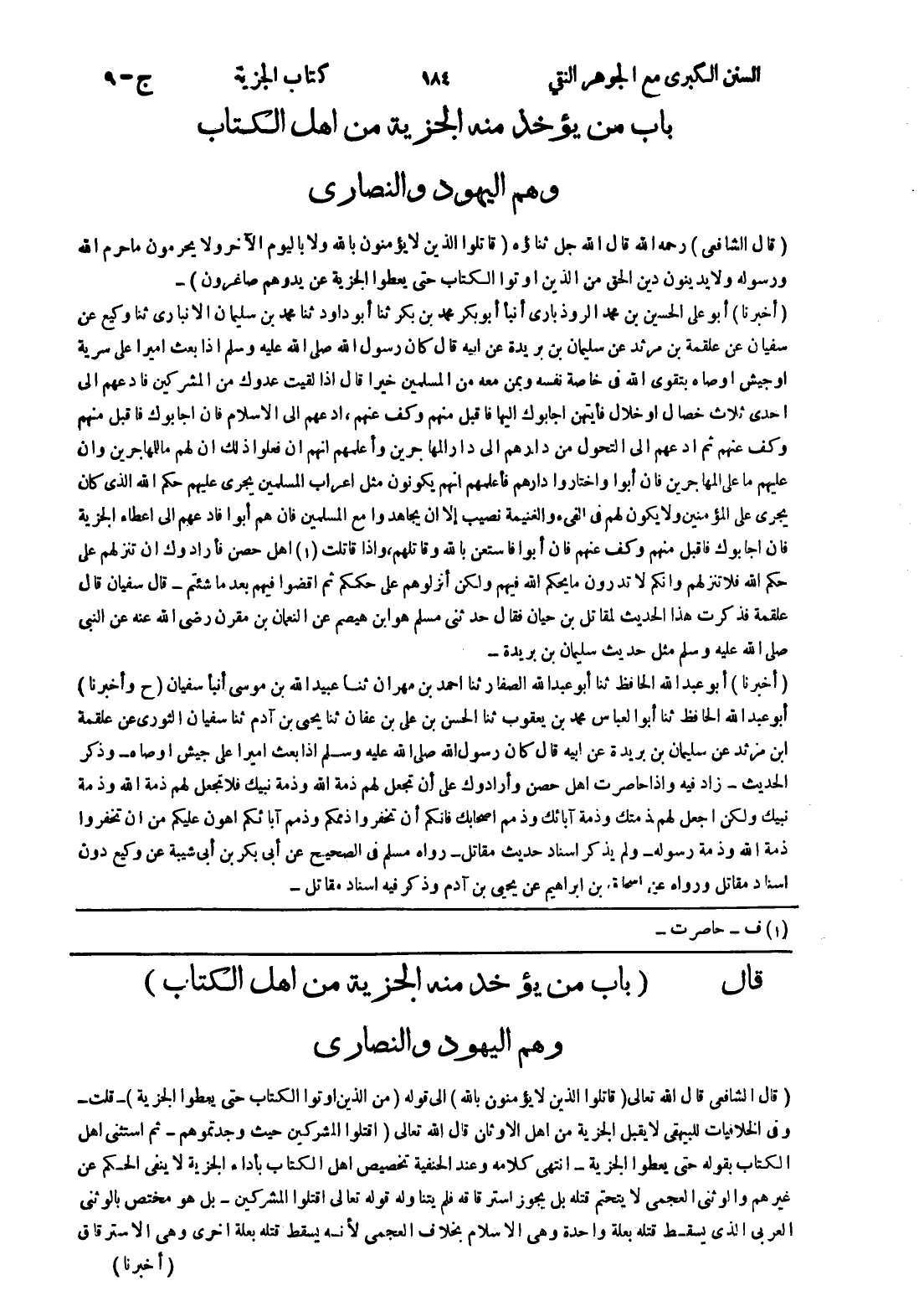 [قال (باب من يؤخذ منه الجزية من اهل الكتاب) وهم اليهود والنصارى (قال الشافعي قال الله تعالى (قاتلوا الذين لا يؤمنون بالله) إلى قوله (من الذين اوتوا الكتاب حتى يعطوا الجزية) - قلت - وفى الخلافيات للبيهقي لا يقبل الجزية من اهل الاوثان قال الله تعالى (اقتلوا المشركين حيث وجدتموهم - ثم استثنى اهل الكتاب بقوله حتى يعطوا الجزية - انتهى كلامه وعند الحنفية تخصيص اهل الكتاب بأداء الجزية لا ينفى الحكم عن غيرهم والوثنى العجمي لا يتحتم قتله بل يجوز استرقاقه فلم يتناوله قوله تعالى اقتلوا المشركين - بل هو مختص بالوثنى العربي الذى يسقط قتله بعلة واحدة وهى الاسلام بخلاف العجمي لانه يسقط قتله بعلة اخرى وهى الاسترقاق]