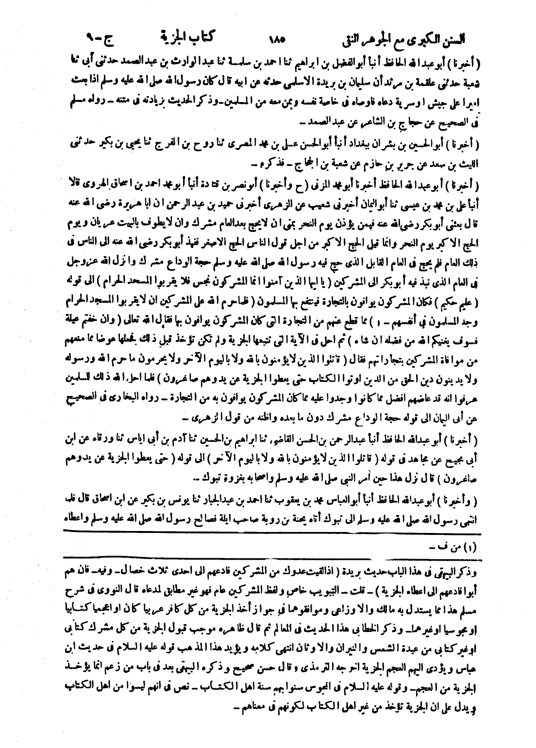 [وذكر البيهقى في هذا الباب حديث بريدة (إذا لقيت عدوك من المشركين فادعهم إلى احدى ثلاث خصال - وفيه - فان هم أبوا فادعهم إلى اعطاء الجزية) - قلت - التبويب خاص ولفظ المشركين عام فهو غير مطابق لمدعاه قال النووي في شرح مسلم هذا مما يستدل به مالك والاوزاعي وموافقوهما في جواز أخذ الجزية من كل كافر عربيا كان أو اعجميا كتابيا أو مجوسيا أو غيرهما - وذكر الخطابى هذا الحديث في المعالم ثم قال ظاهره موجب قبول الجزية من كل مشرك كتابي أو غير كتابي من عبدة الشمس والنيران والاوثان انتهى كلامه ويؤيد هذا المذهب قوله عليه السلام في حديث ابن عباس ويؤدى إليهم العجم الجزية اخرجه الترمذي وقال حسن صحيح وذكره البيهقى بعد في باب من زعم انما يؤخذ الجزية من العجم - وقوله عليه السلام في المجوس سنوا بهم سنة اهل الكتاب - نص في انهم ليسوا من اهل الكتاب ويدل على ان الجزية تؤخذ من غير اهل الكتاب لكونهم في معناهم]